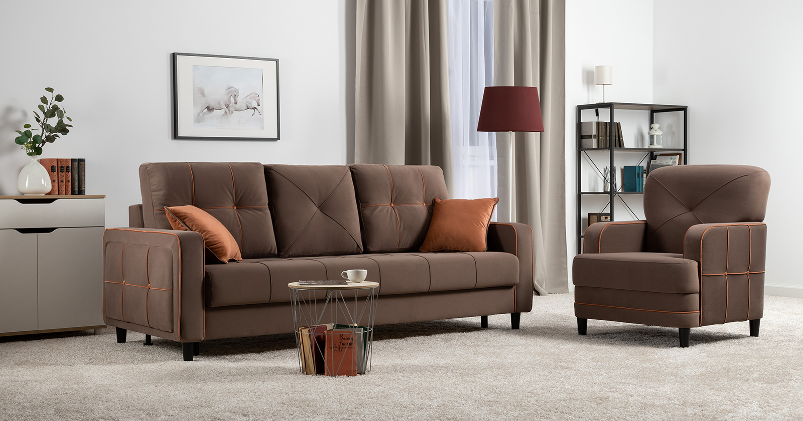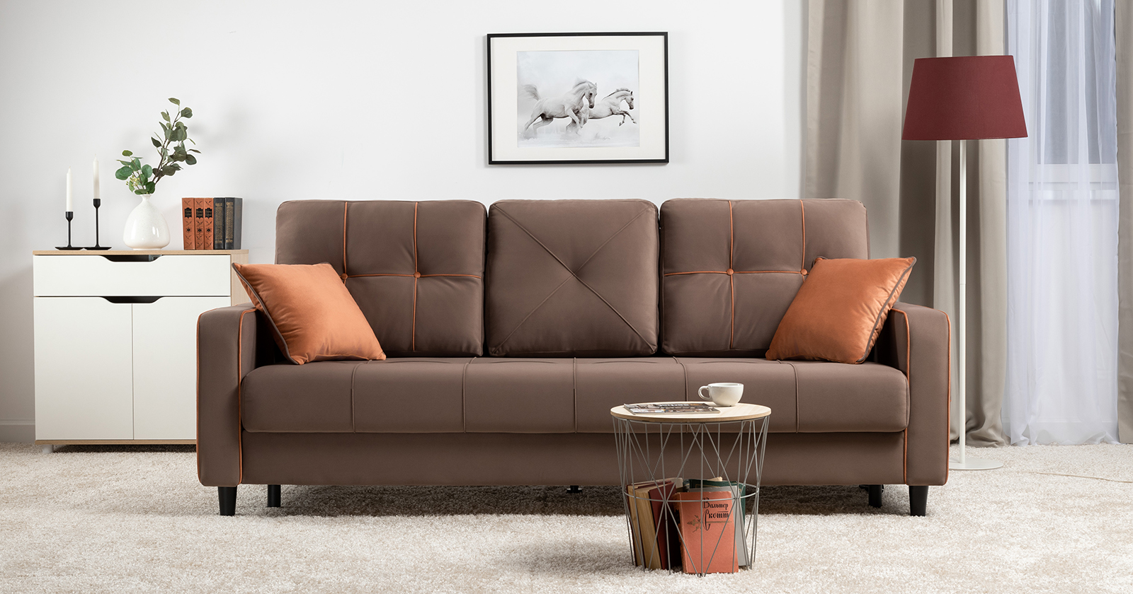 Модные диваны Черри Н порадуют поклонников современного стиля. Контрастные канты, пуговицы и декоративные подушки делают этот диван ярким акцентом интерьера.