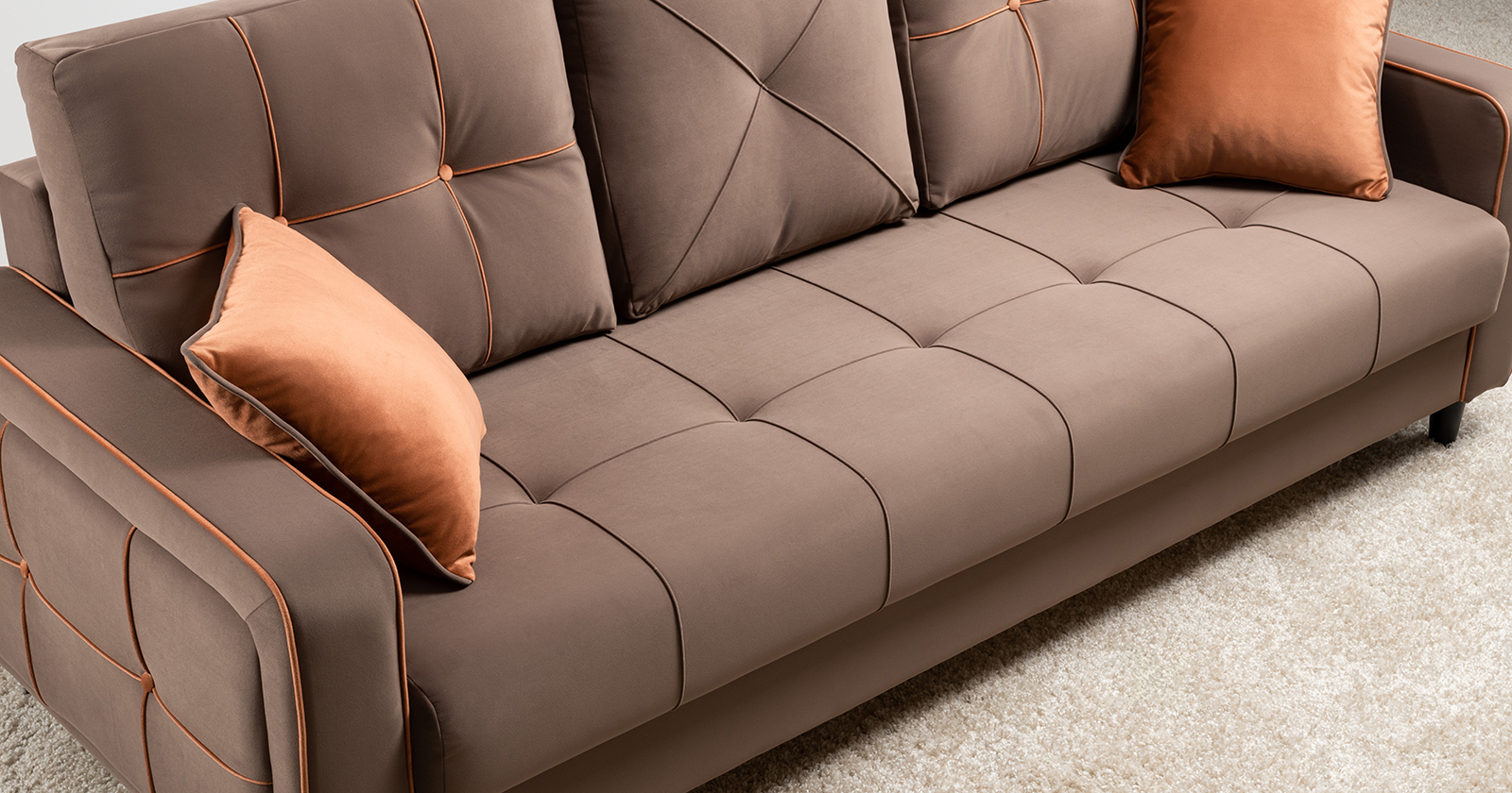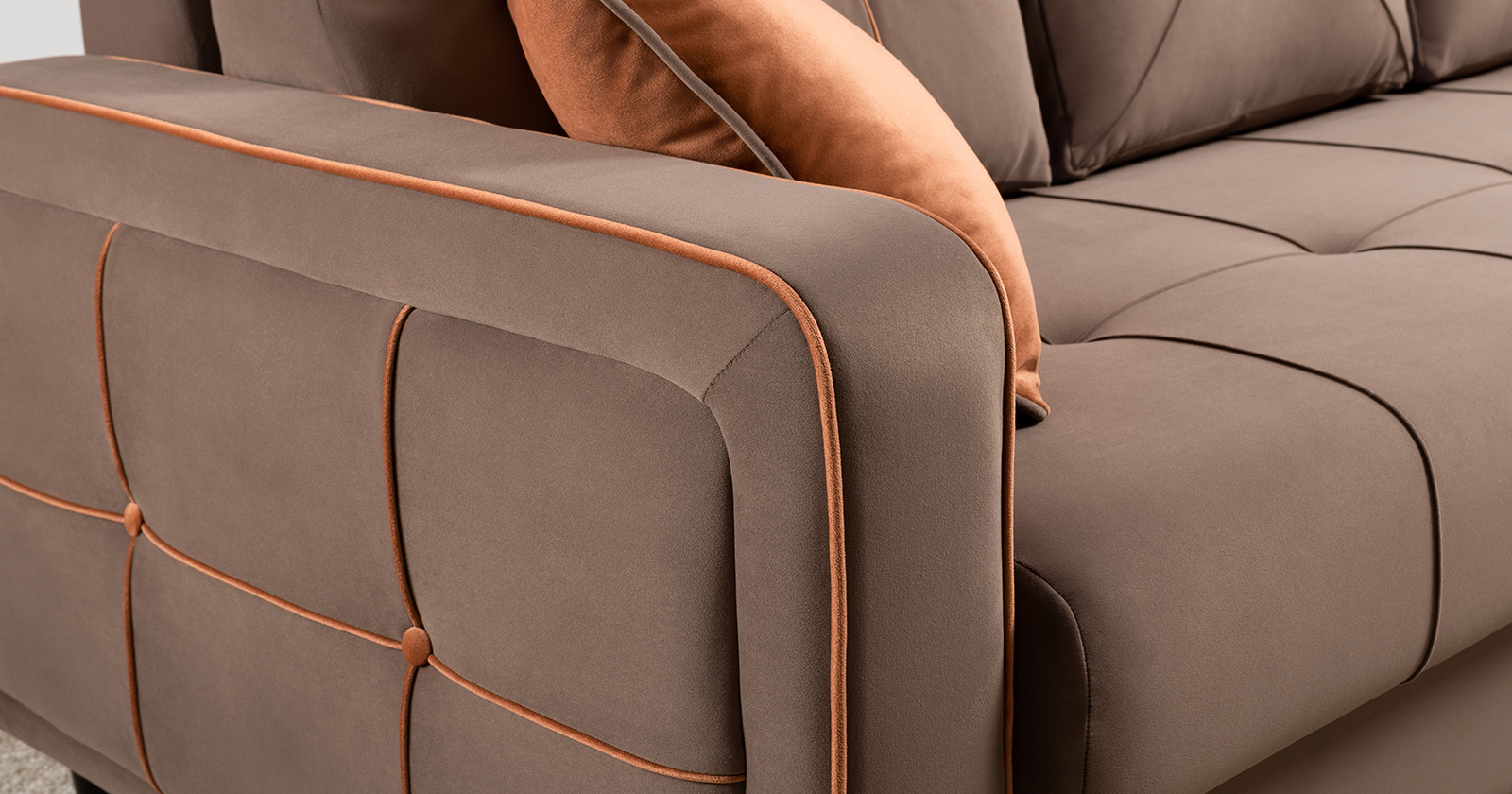 Декоративные канты на подушках и вставке подлокотников. Пуговицы в местах пересечения кантов на подушке и вставке подлокотников. По торцам подлокотников и думках контрастный декоративный кант. Защипы на сиденье и средней большой подушке.