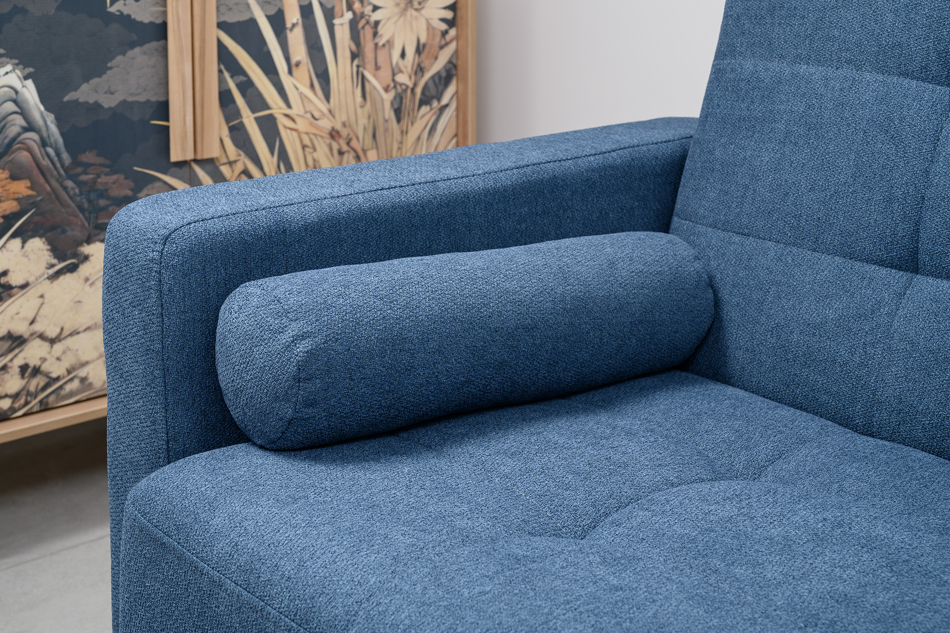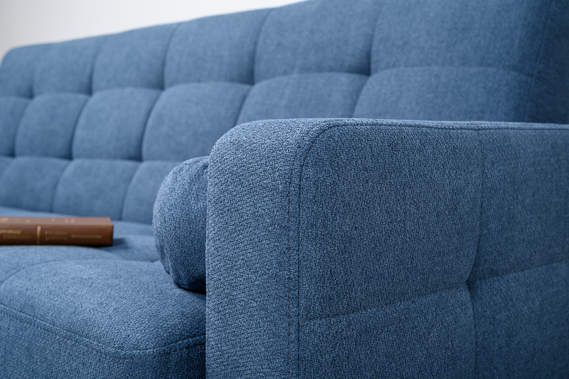 Прямоугольная стежка по спинке, посадочному месту и подлокотниках, круглые подушки-валики