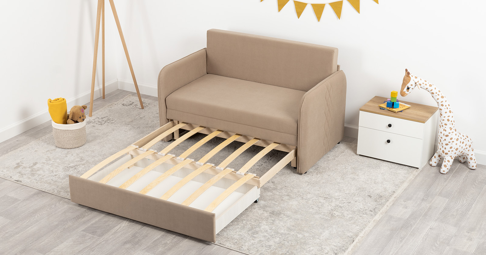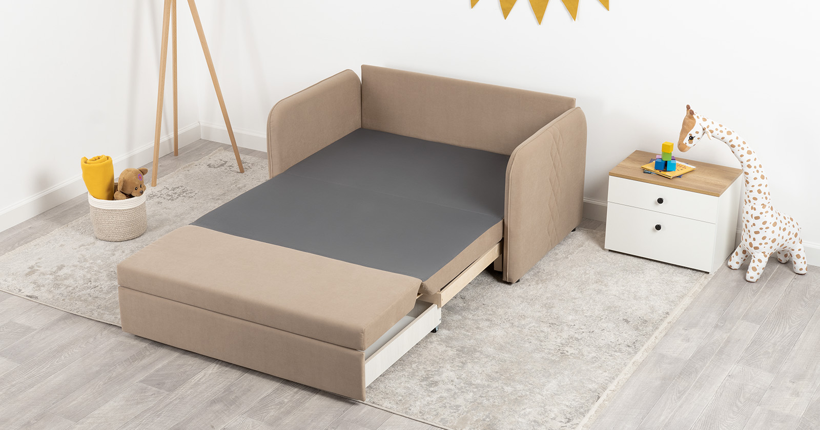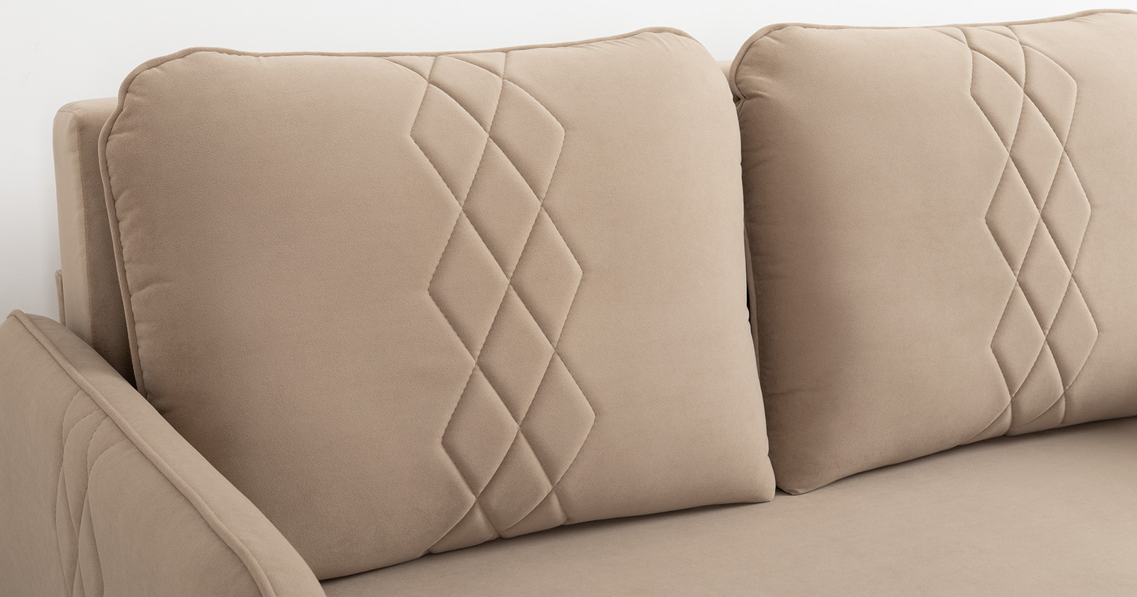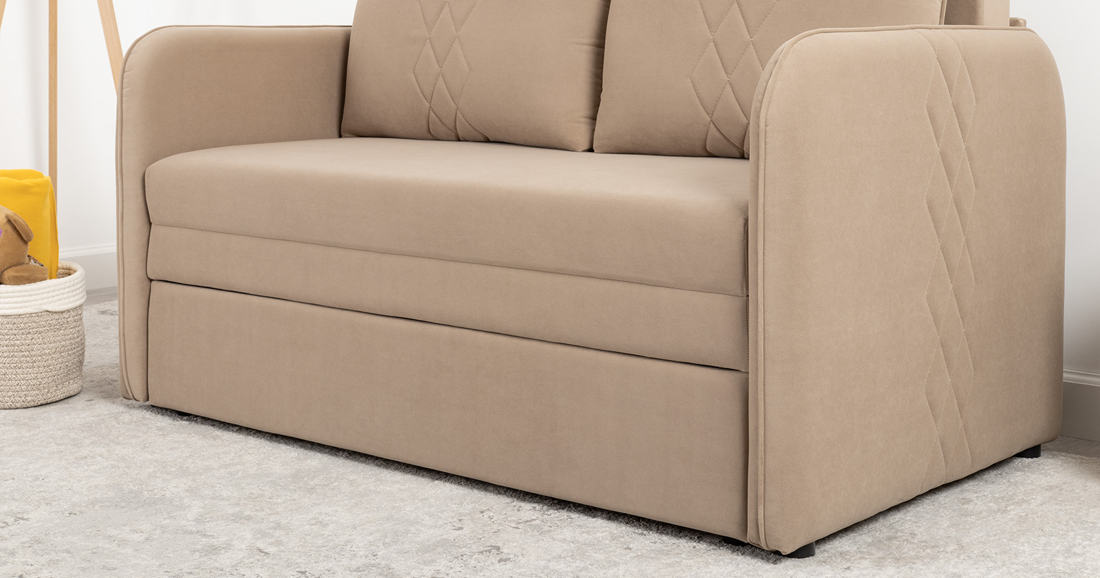 Стильный компактный диван для детской и гостиной. При своих скромных размерах он трансформируется в полноценное спальное место для детей и подростков. Лаконичный дизайн в виде декоративной стежки подчеркивает фактуру велюра, а небольшие размеры позволят разместить его в любом пространстве.