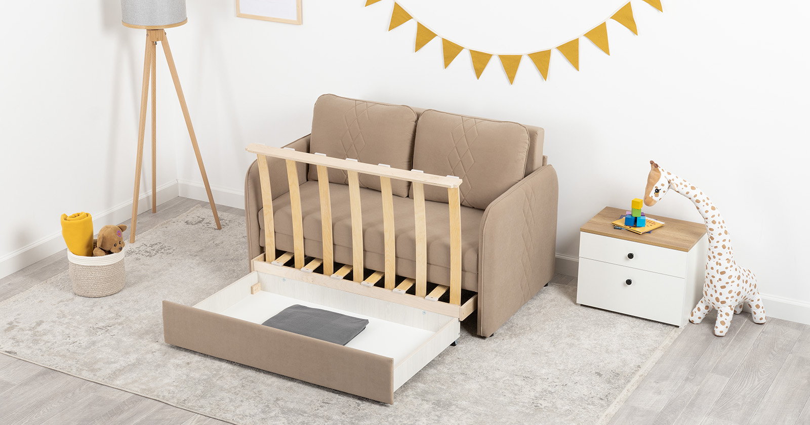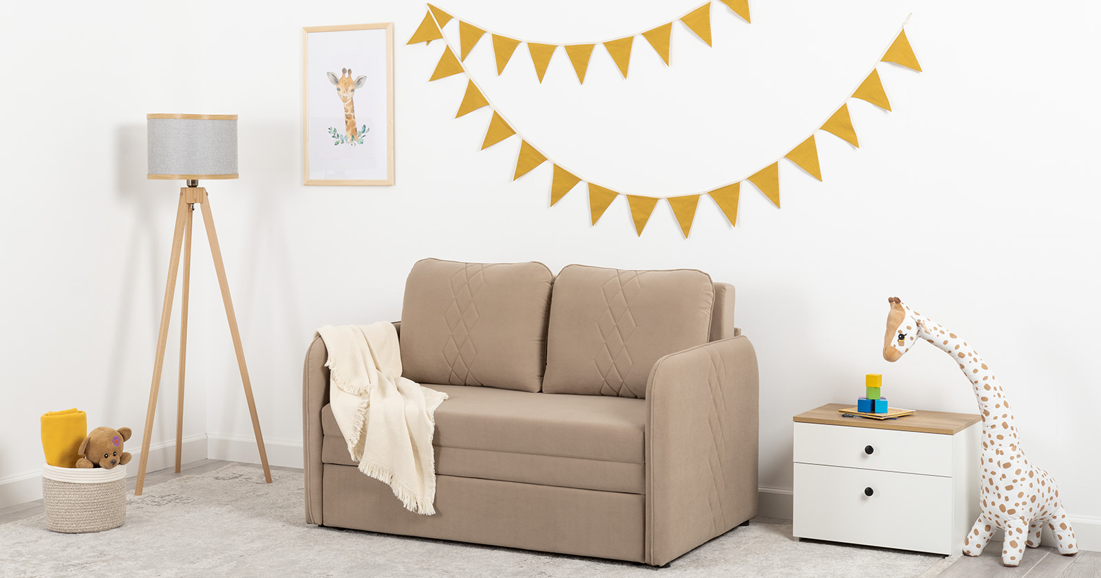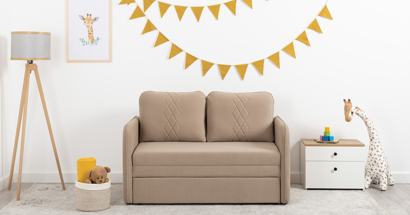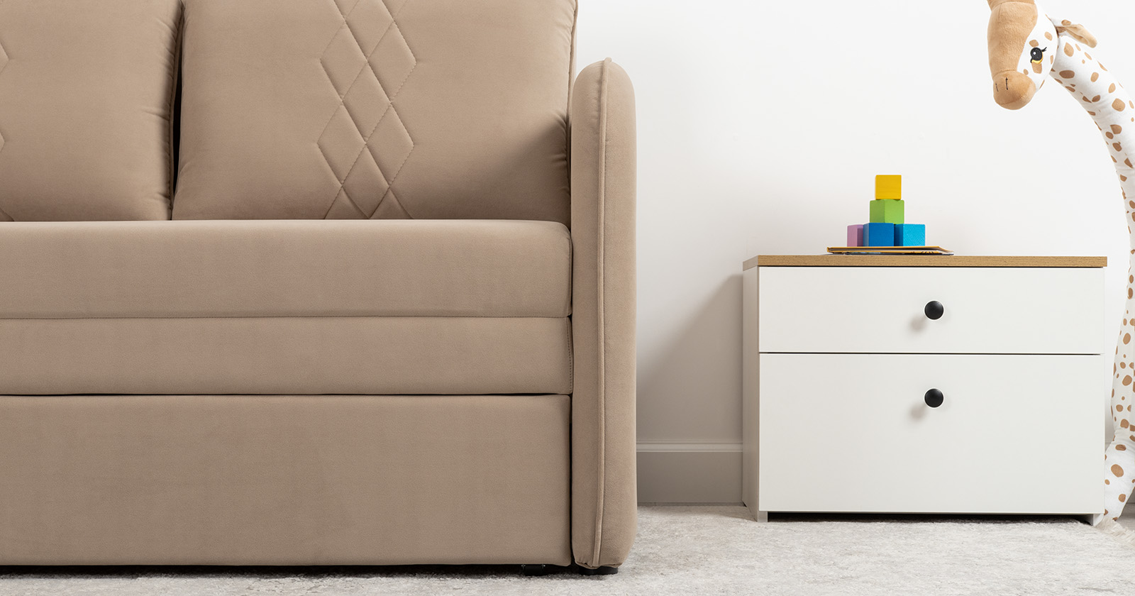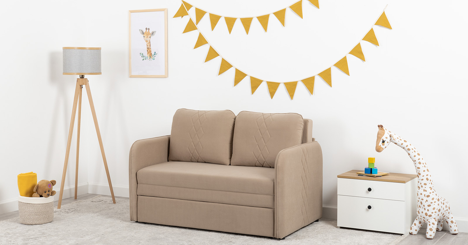Стильный компактный диван для детской и гостиной. При своих скромных размерах он трансформируется в полноценное спальное место для детей и подростков. Лаконичный дизайн в виде декоративной стежки подчеркивает фактуру велюра, а небольшие размеры позволят разместить его в любом пространстве.