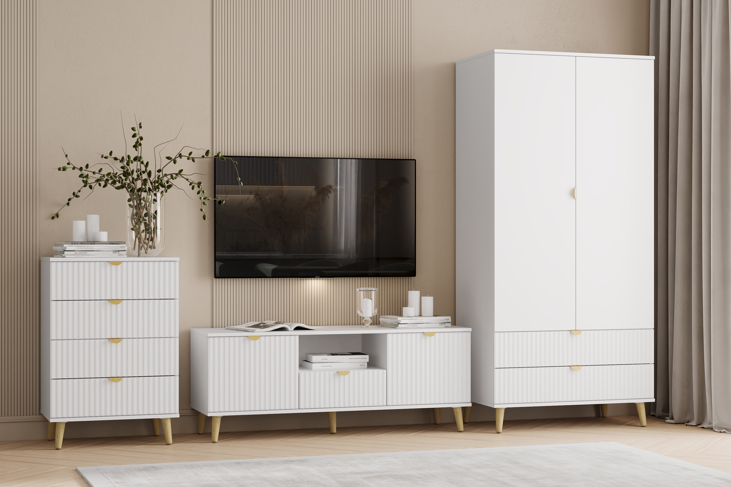 Модульная композиция включает комод и тумбу ТВА, оснащенные выдвижными ящиками, которые открываются плавно и бесшумно благодаря шариковым направляющим, а в шкафу удобно организовать книги, предметы декора или посуду, при этом высокие опоры облегчают процесс уборки.