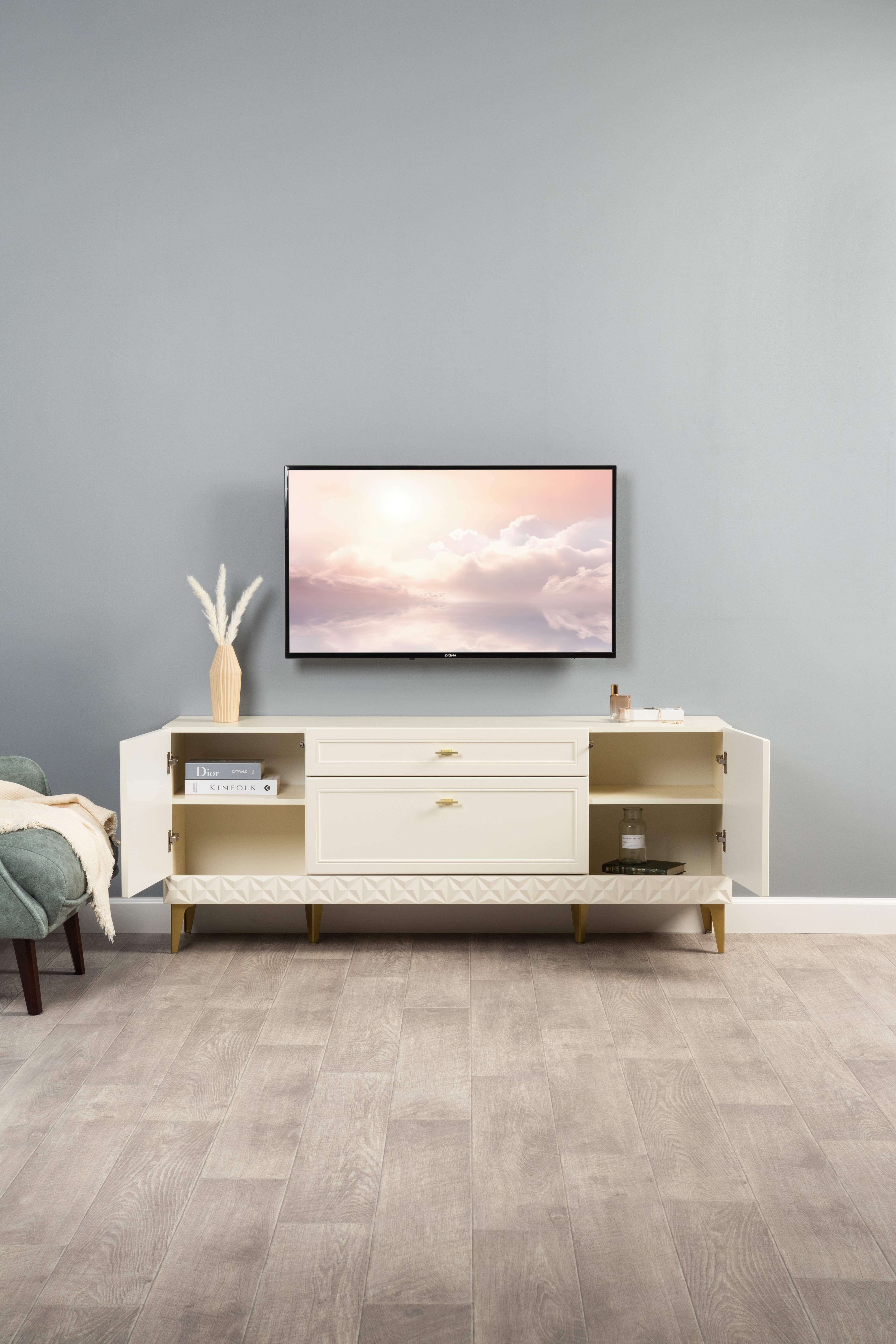 Гостиная Марион композиция 3 слоновая кость С341 PE, слоновая кость 6898 ПВХ, белый PE шагрень (собирается на любую сторону)