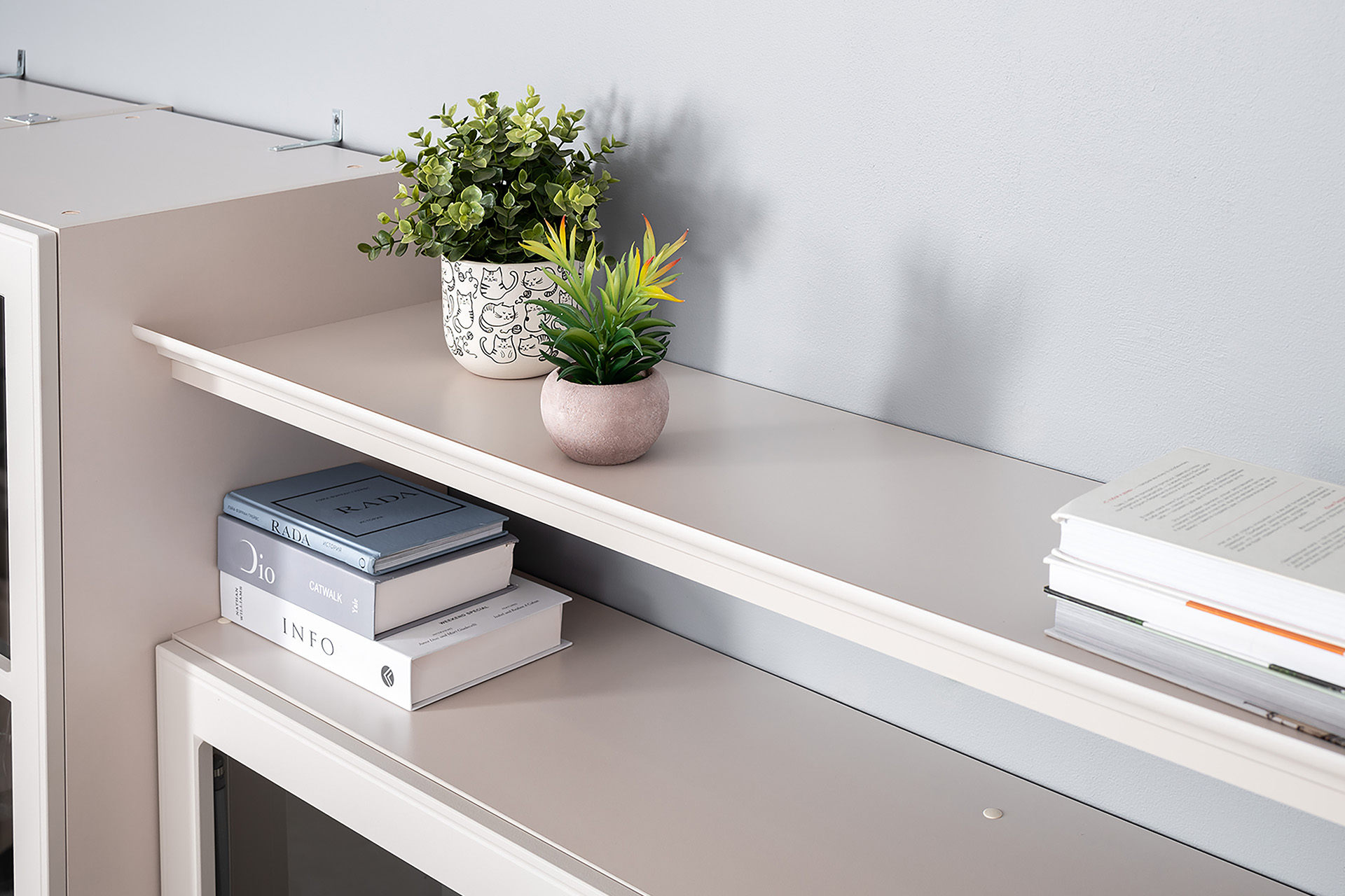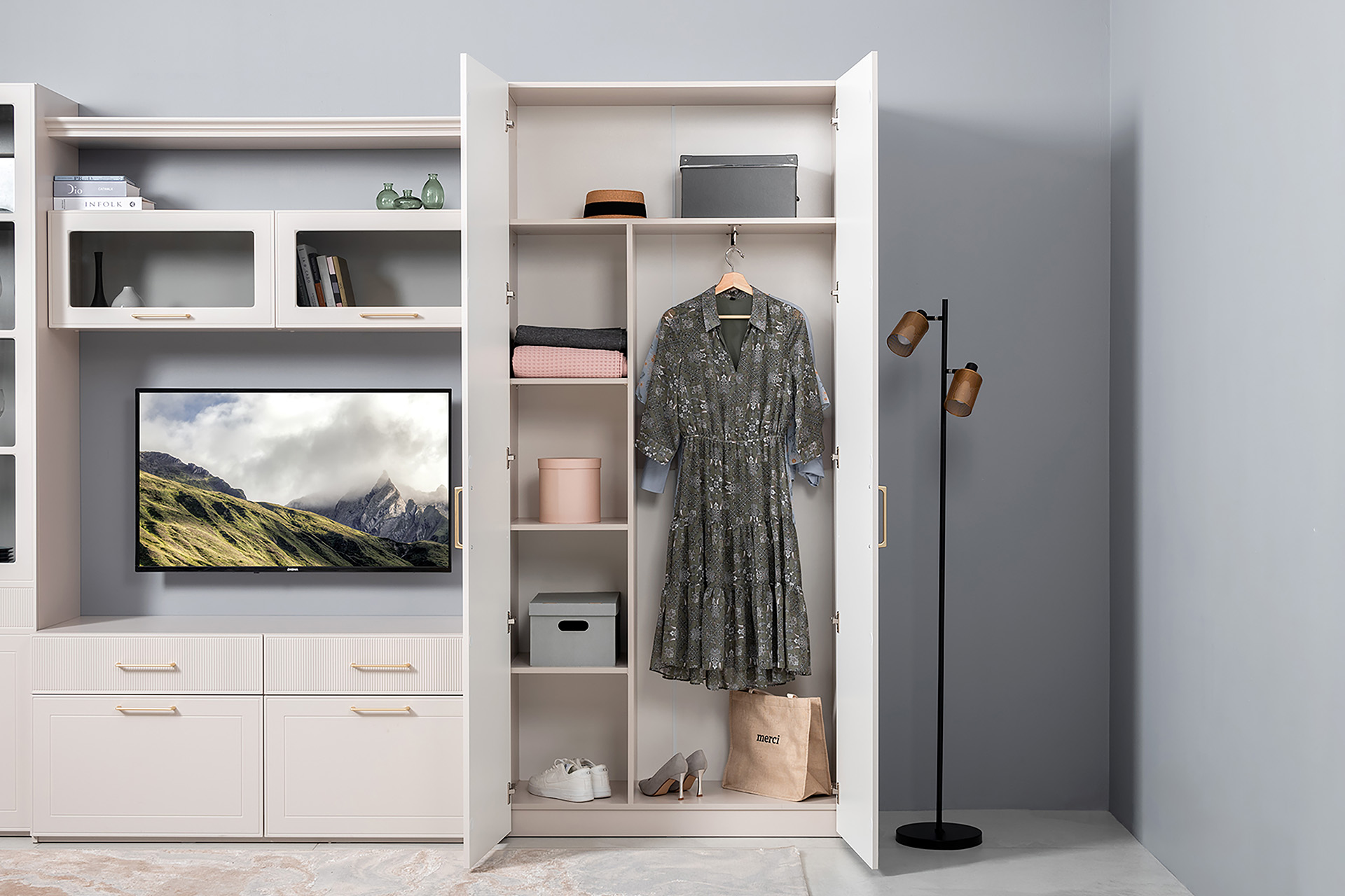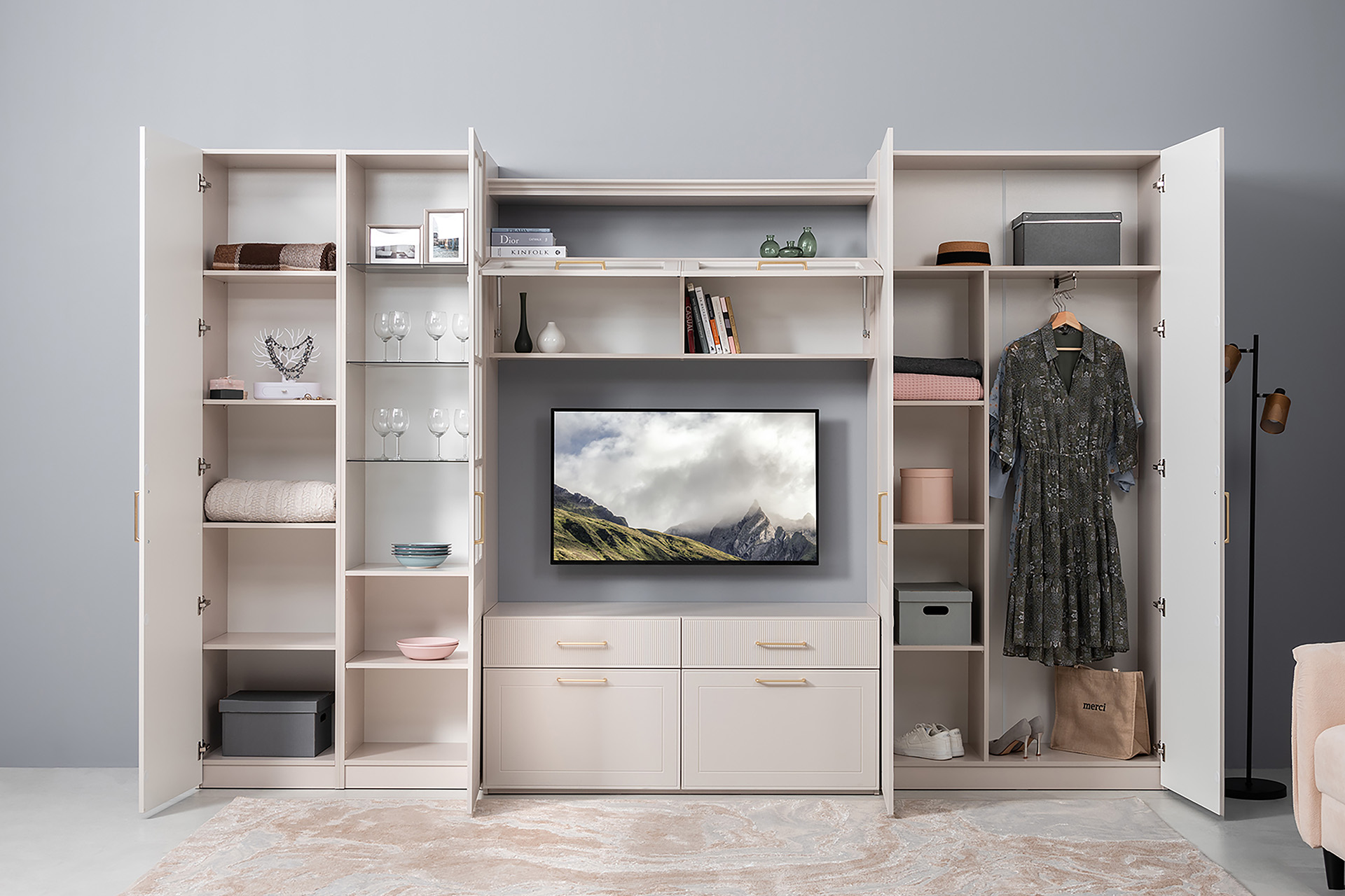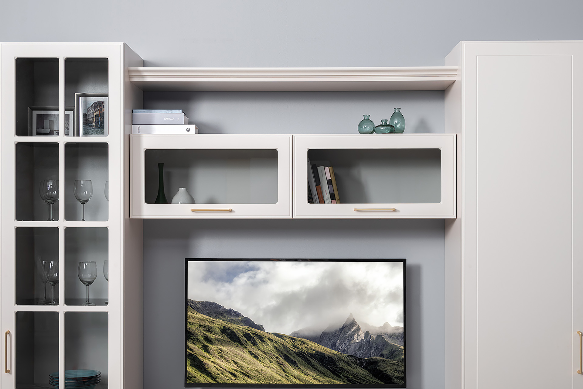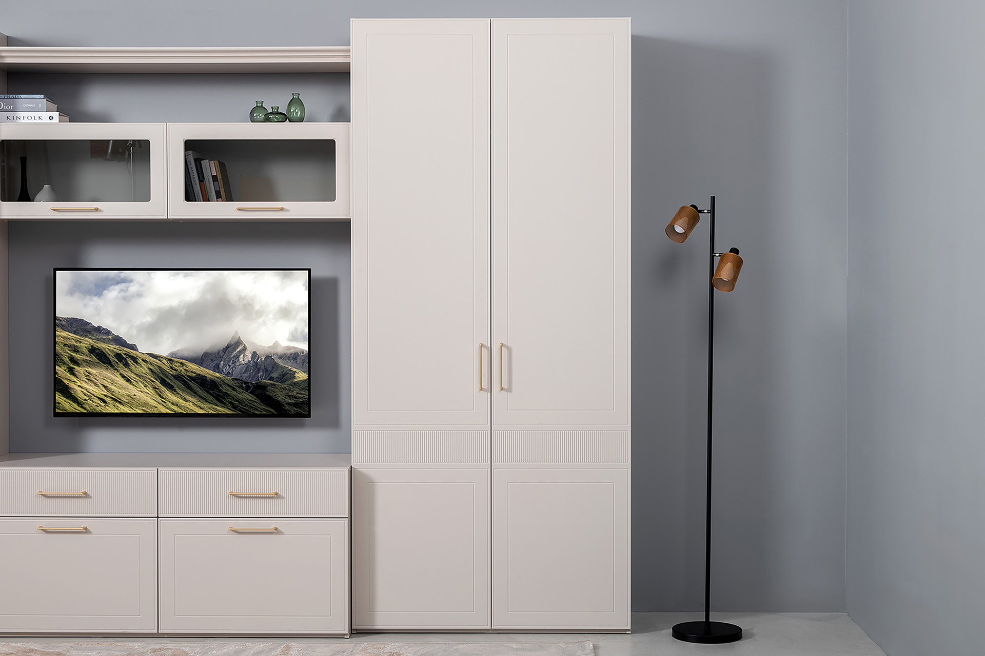 Гостиная Ричфорд композиция 1 без карнизов, кашемир 5981 BS, моно керамика D166-2 ПВХ, белый PE шагрень (собирается на любую сторону)
