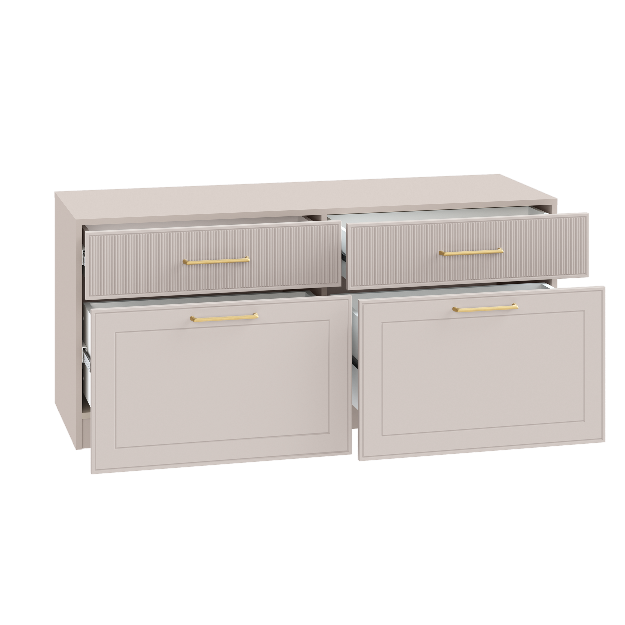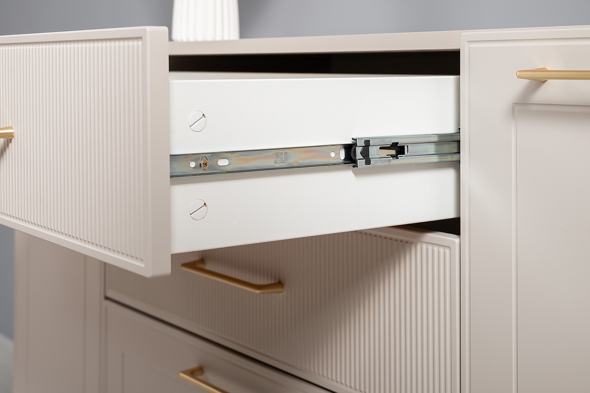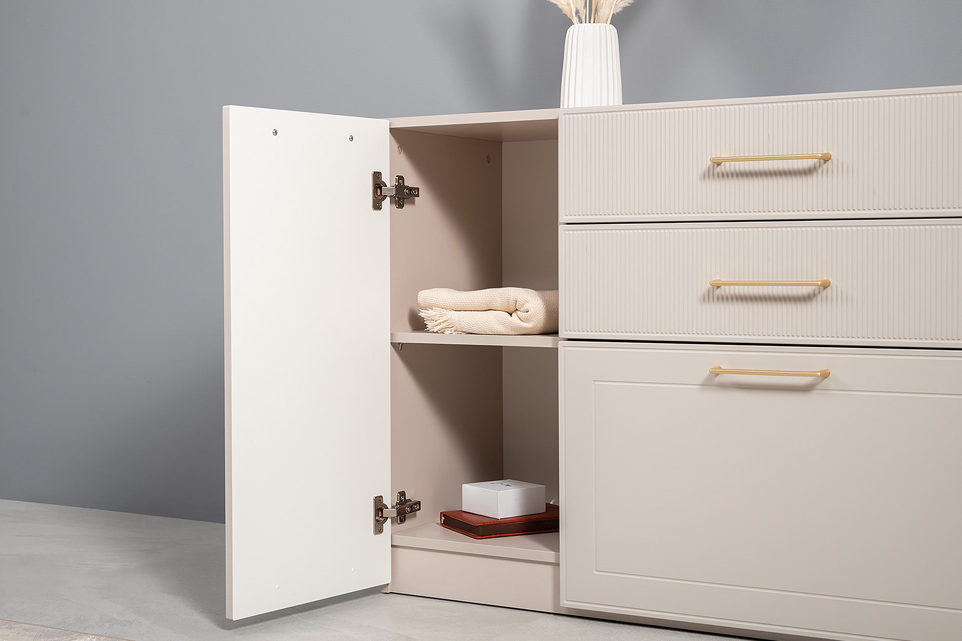 Петли с доводчиками, полное выдвижение ящиков, выдвижная штанга в шкафу для одежды и съемные полки делают использование максимально комфортным.