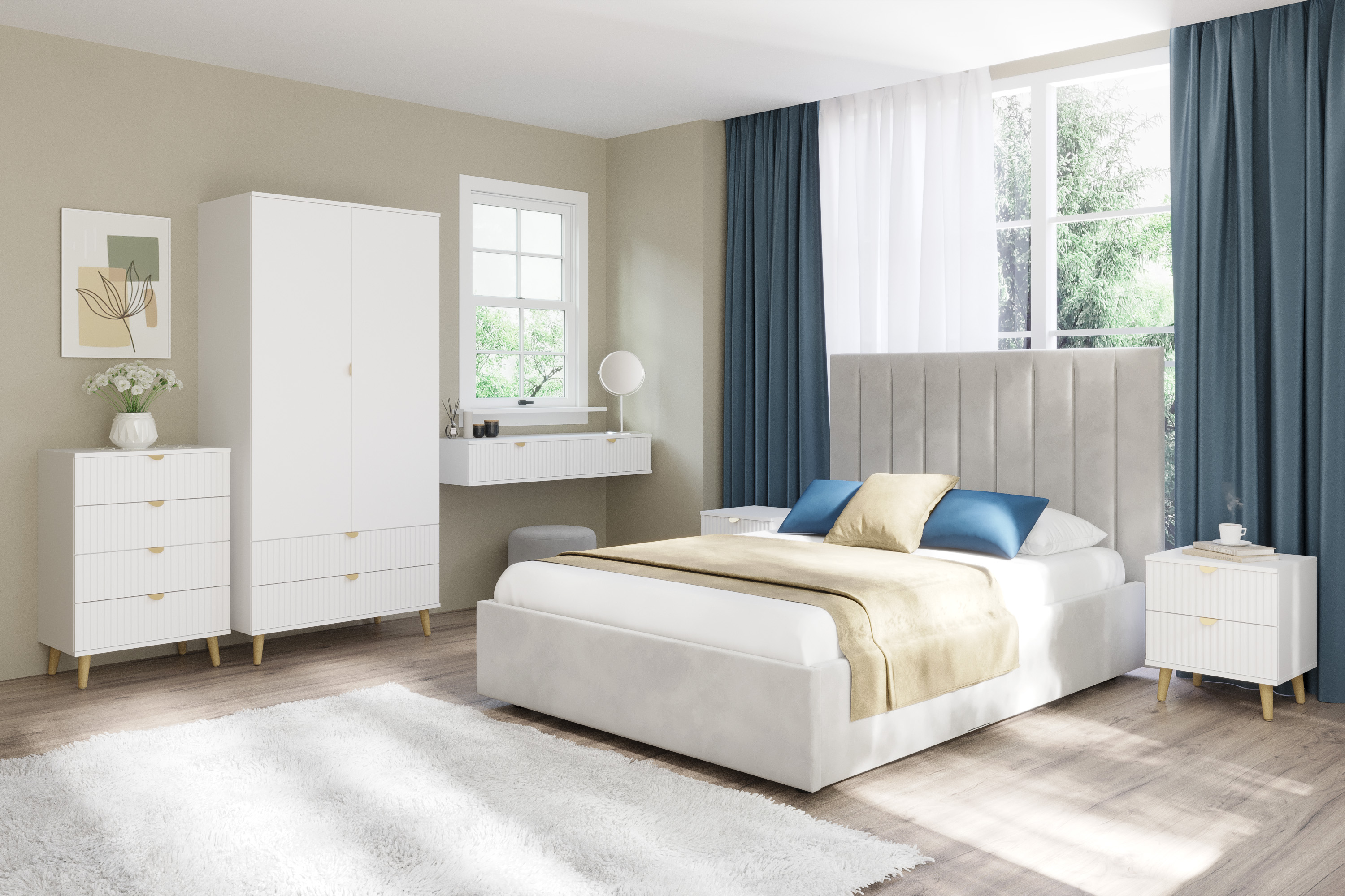 Комод оснащен четырьмя выдвижными ящиками, которые открываются плавно и бесшумно благодаря шариковым направляющим, а высокие опоры облегчают процесс уборки.