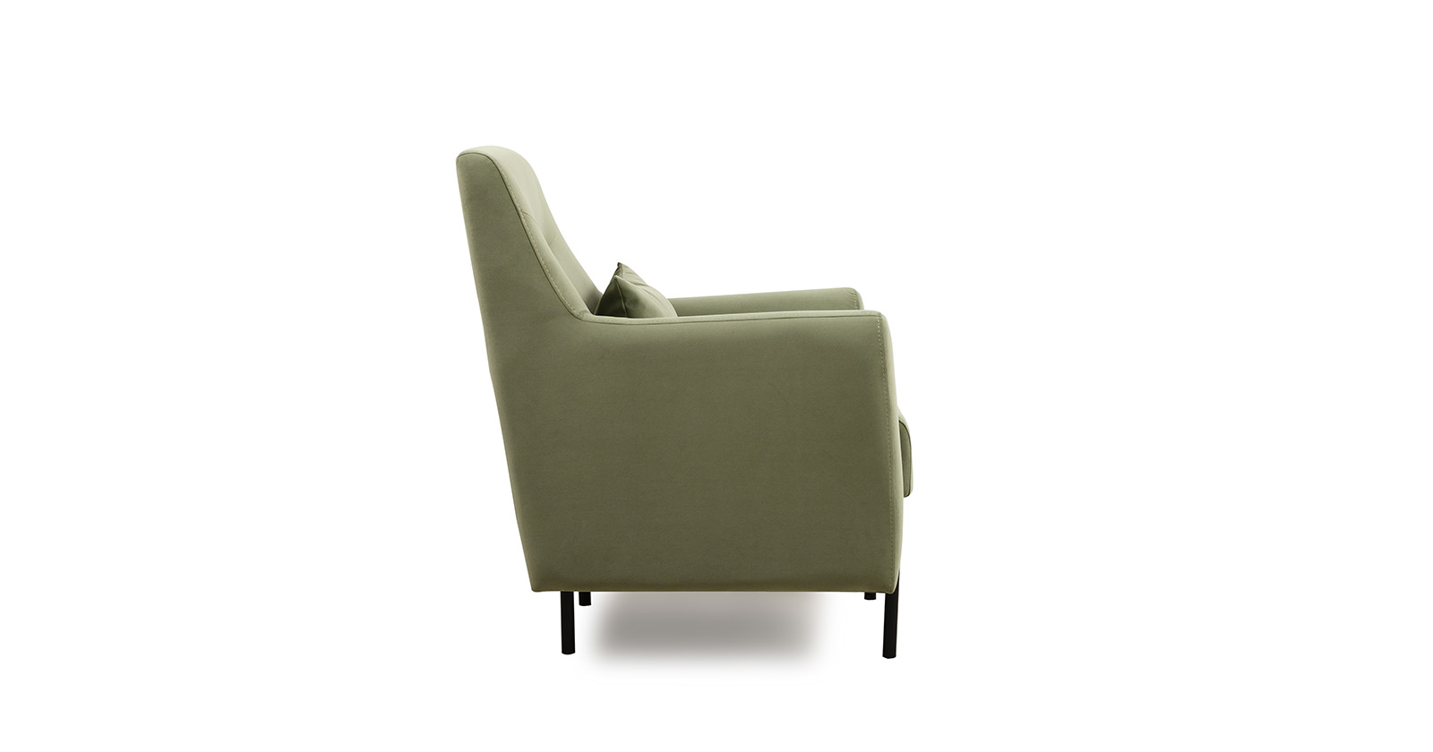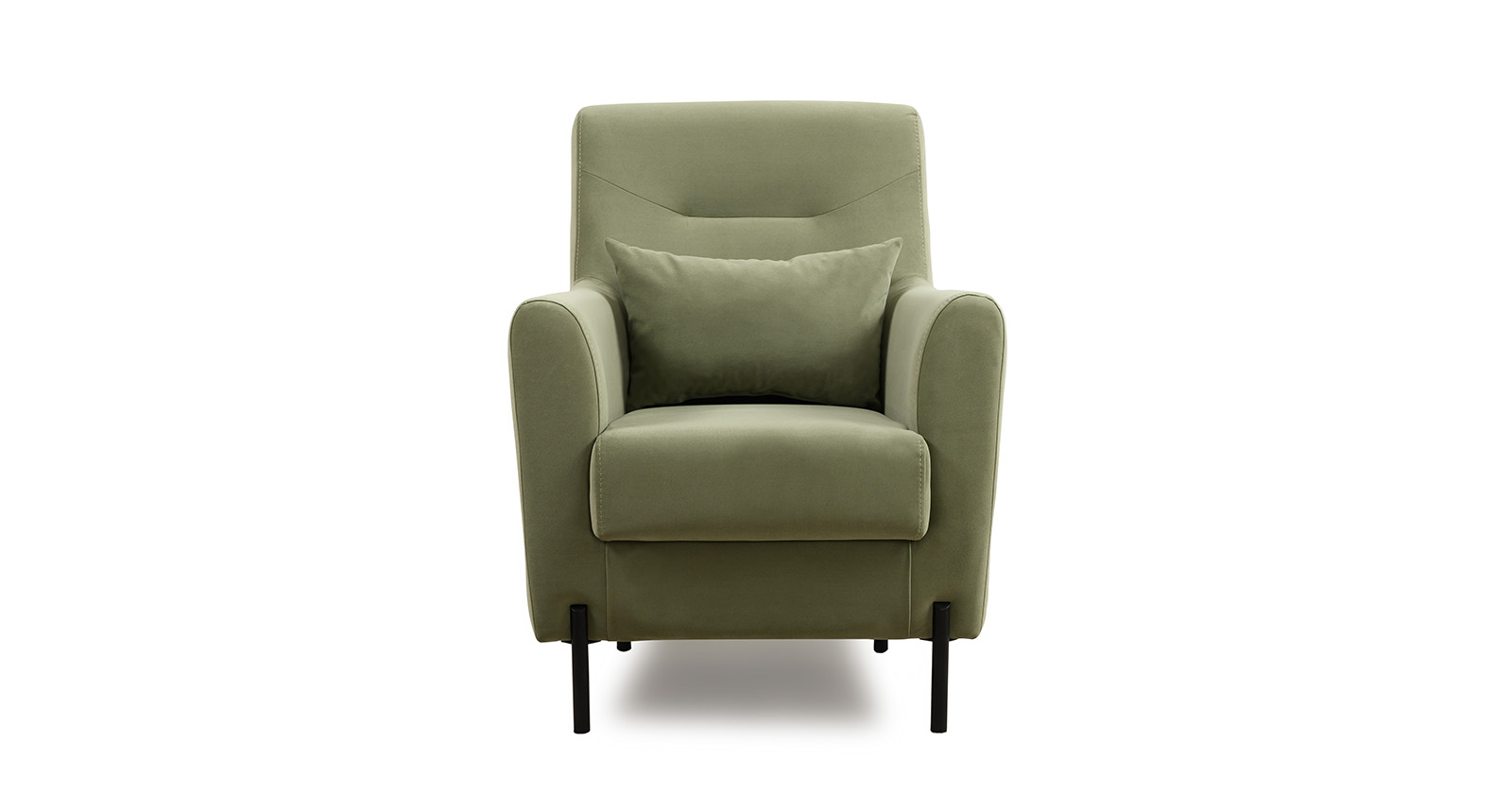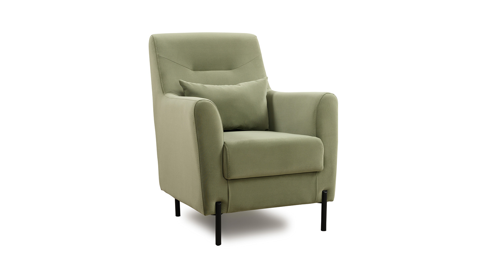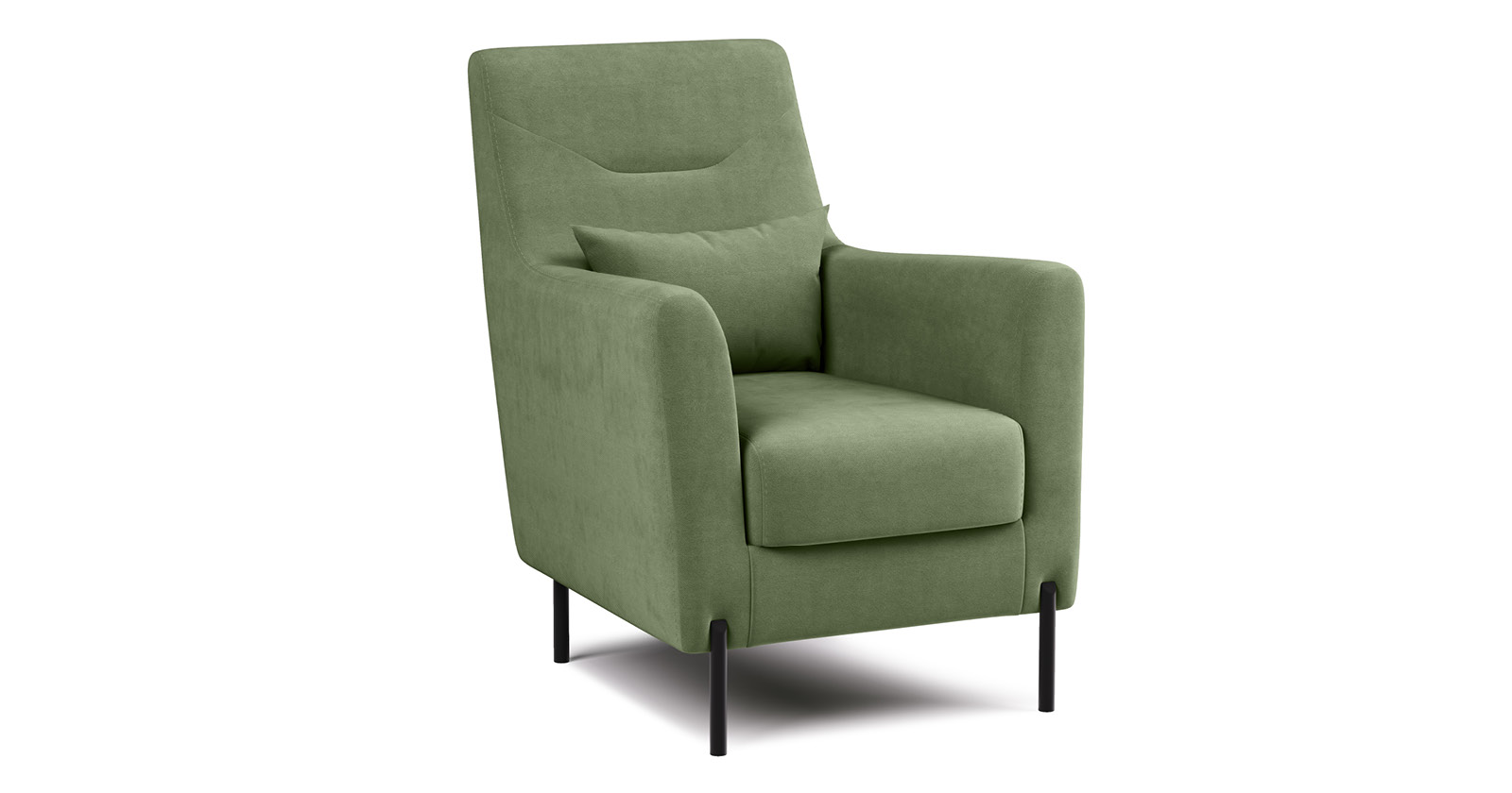 Декоративная утяжка на спинке кресла, декоративная подушка в цвете кресла, металлические опоры переходят в декоративный элемент подлокотника