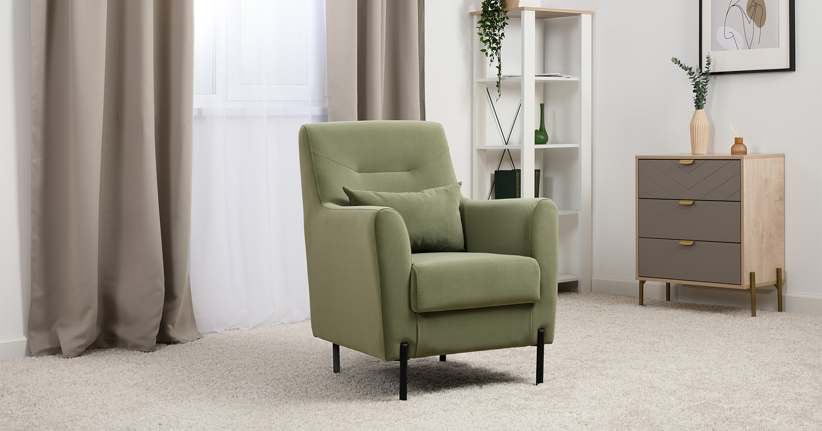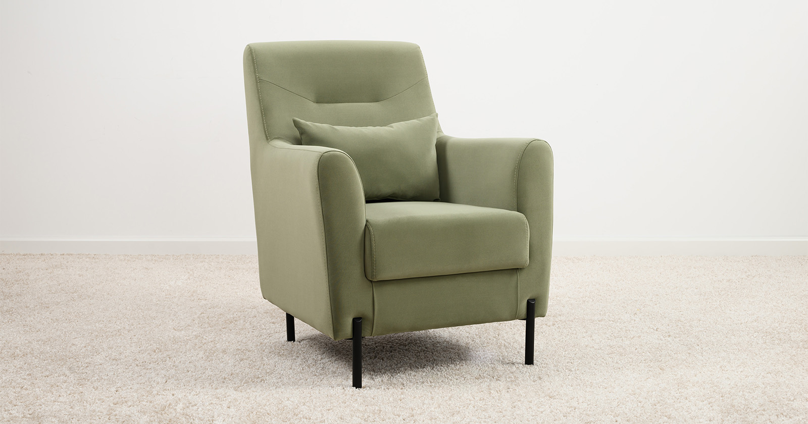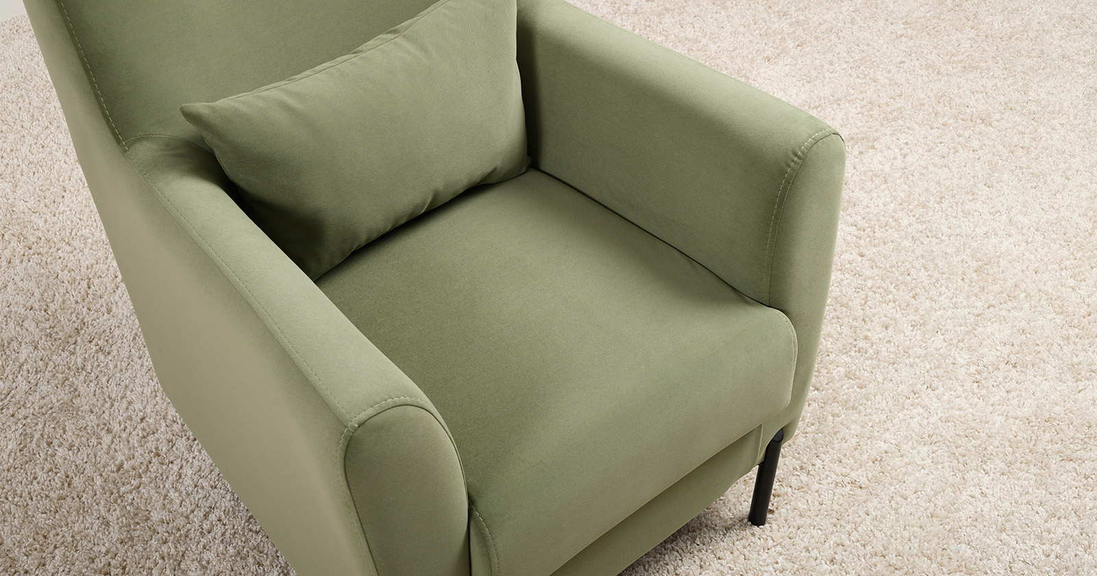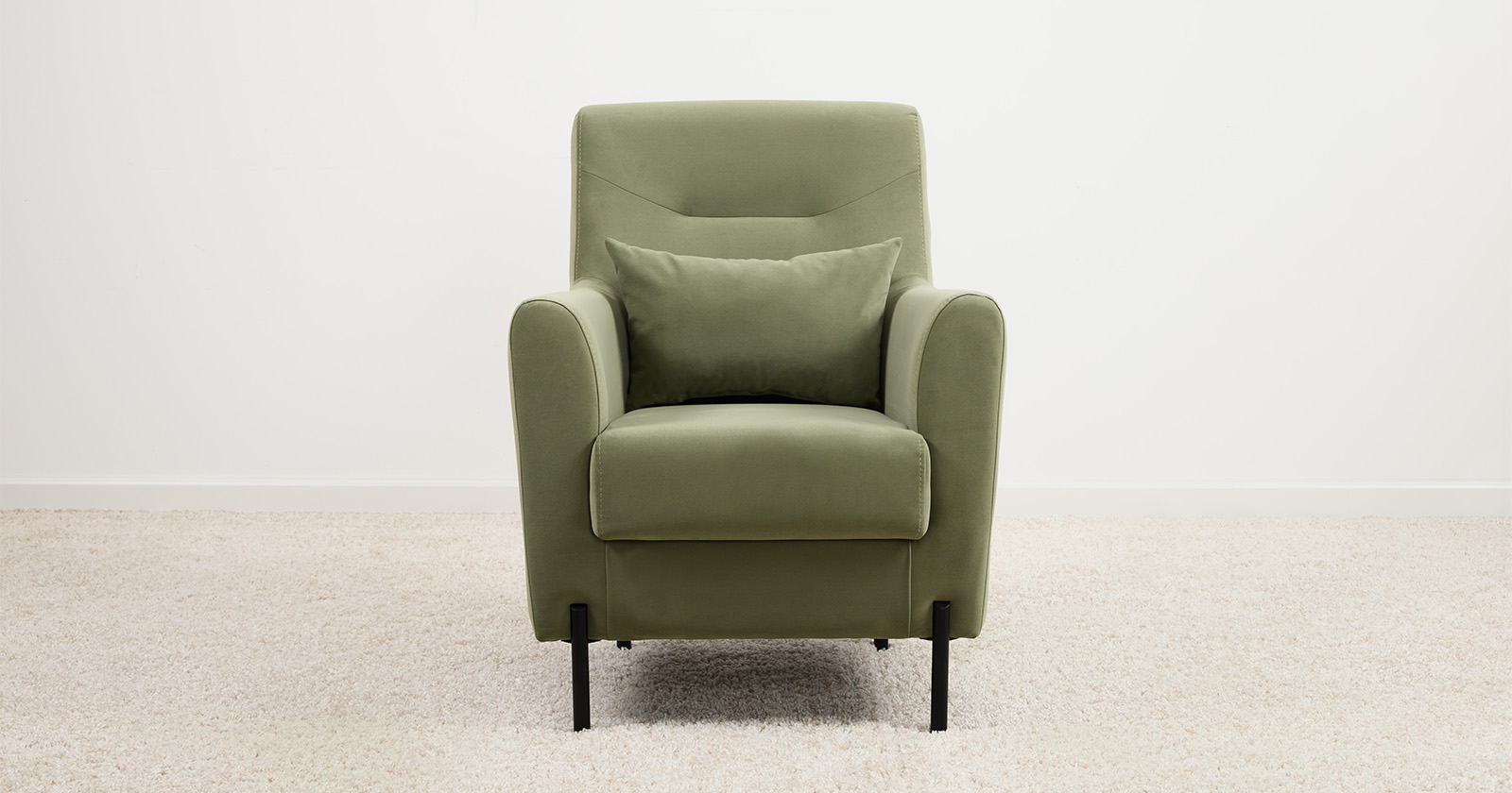 Декоративная утяжка на спинке кресла, декоративная подушка в цвете кресла, металлические опоры переходят в декоративный элемент подлокотника