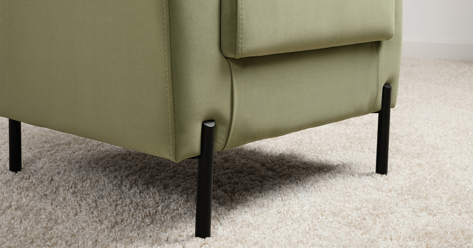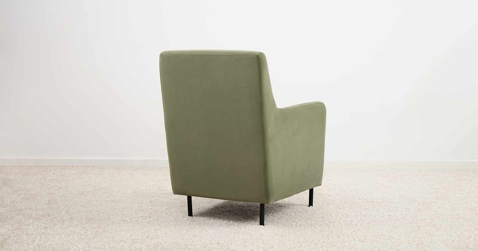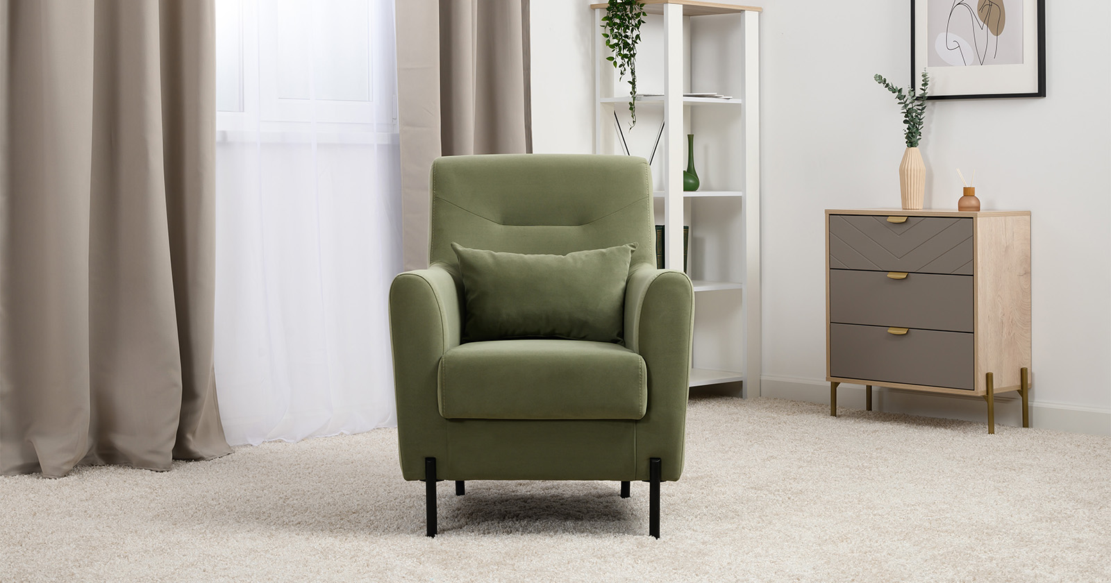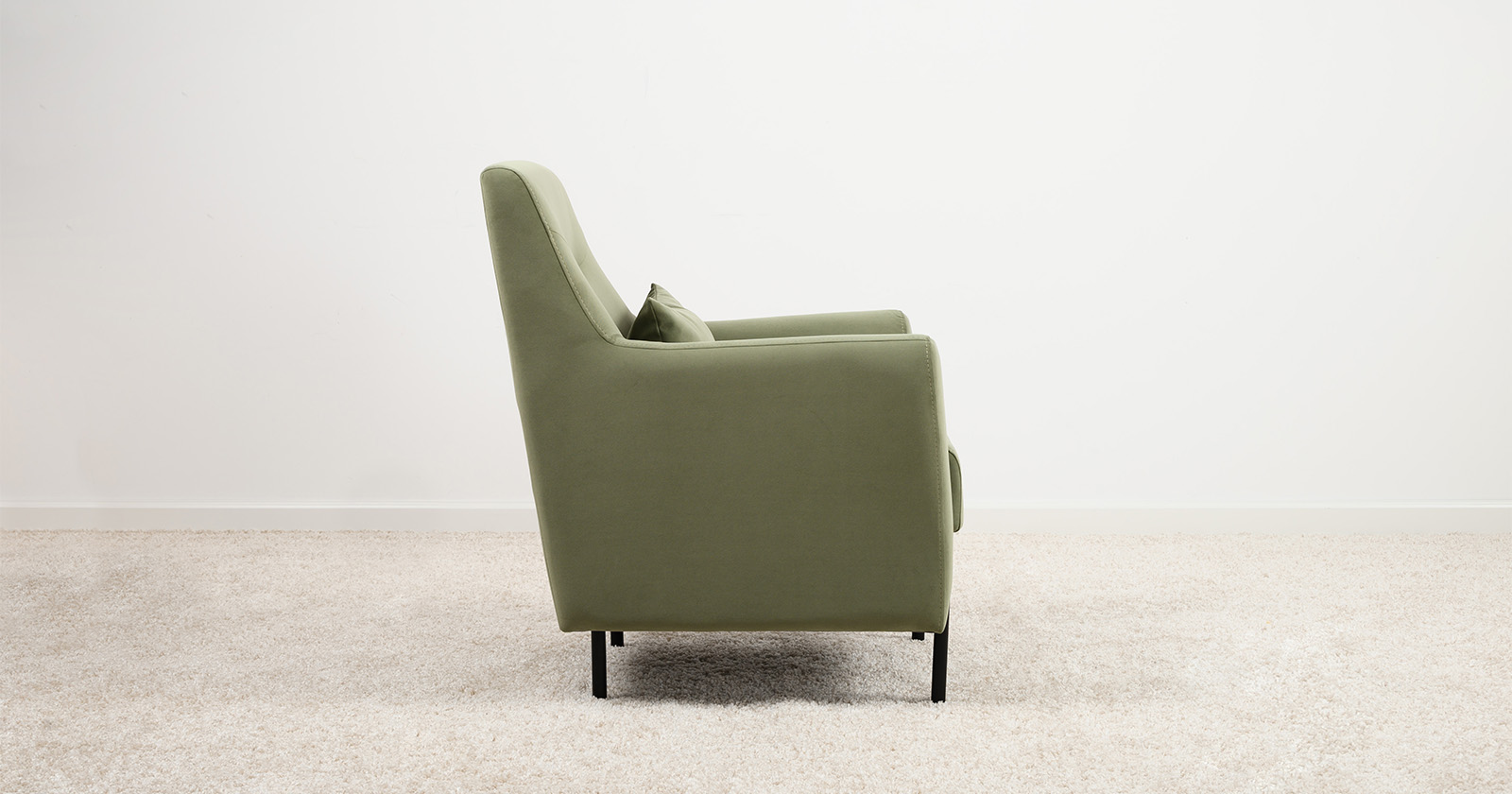 Декоративная утяжка на спинке кресла, декоративная подушка в цвете кресла, металлические опоры переходят в декоративный элемент подлокотника