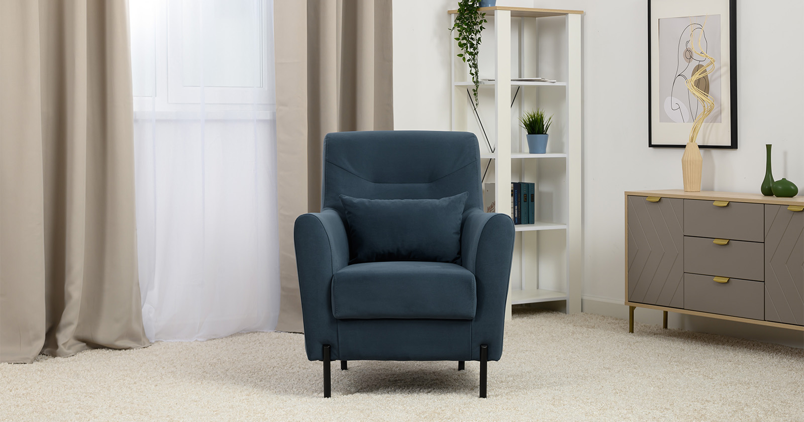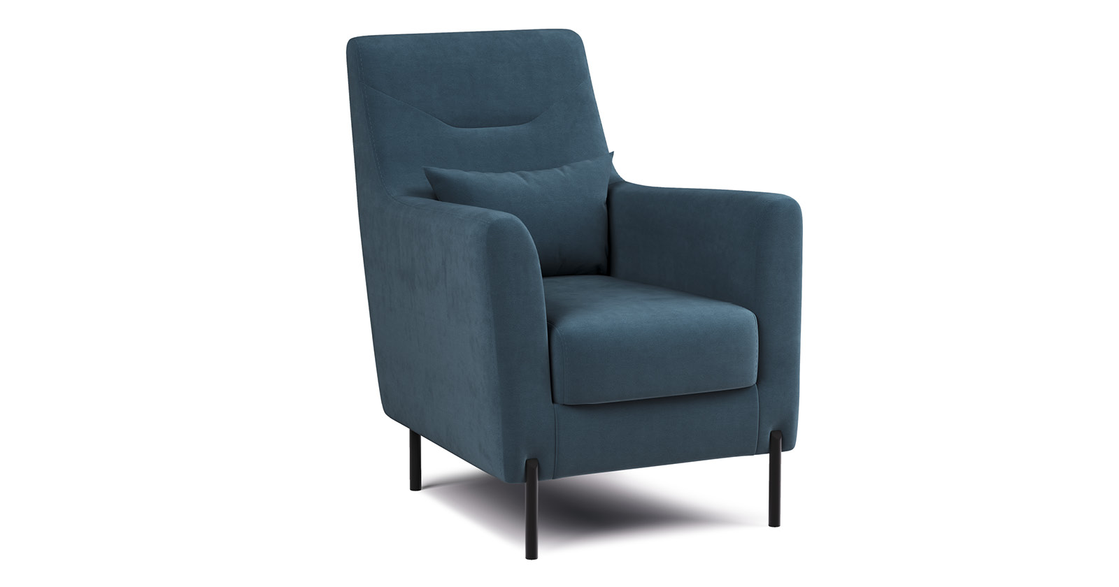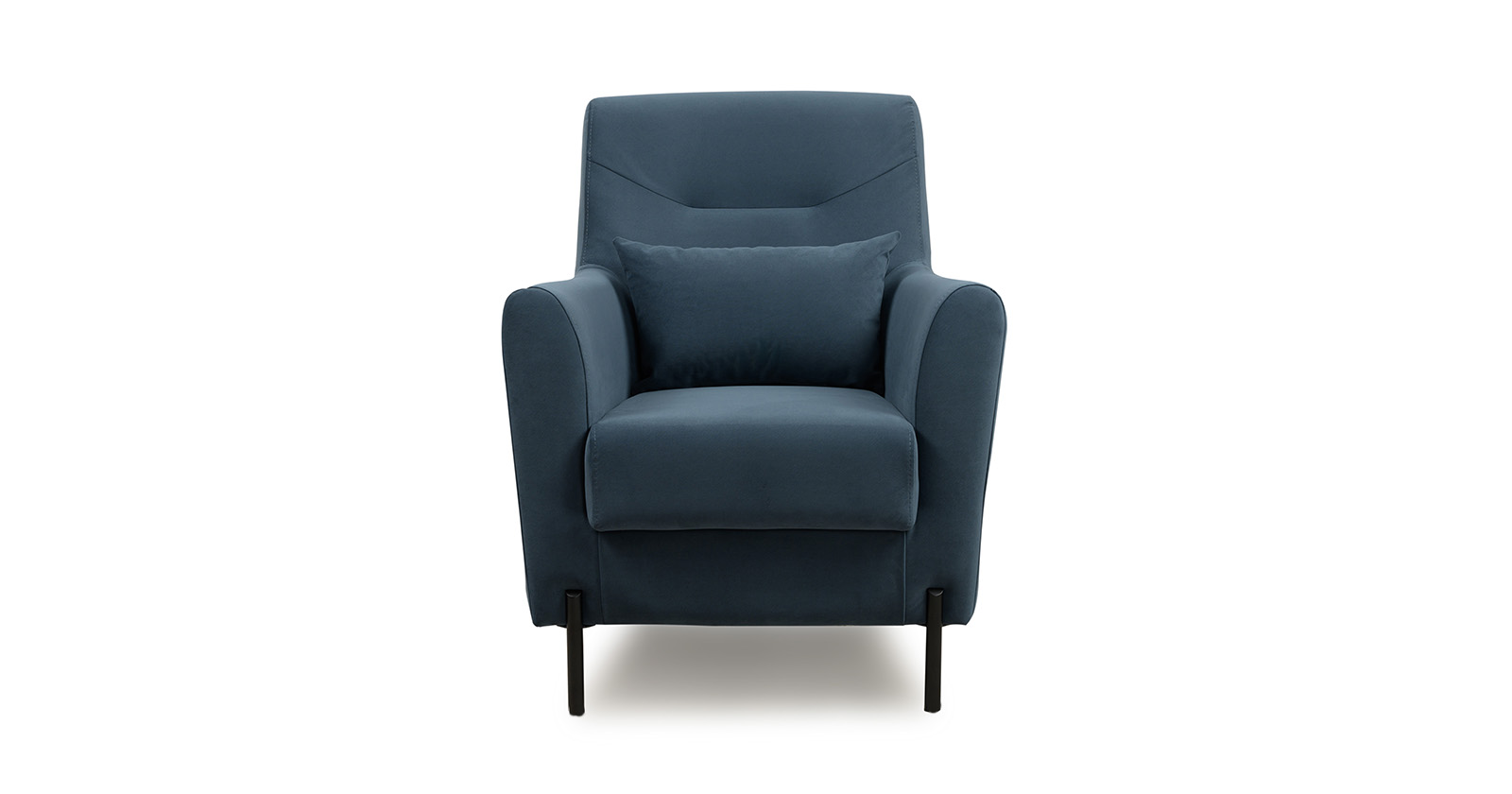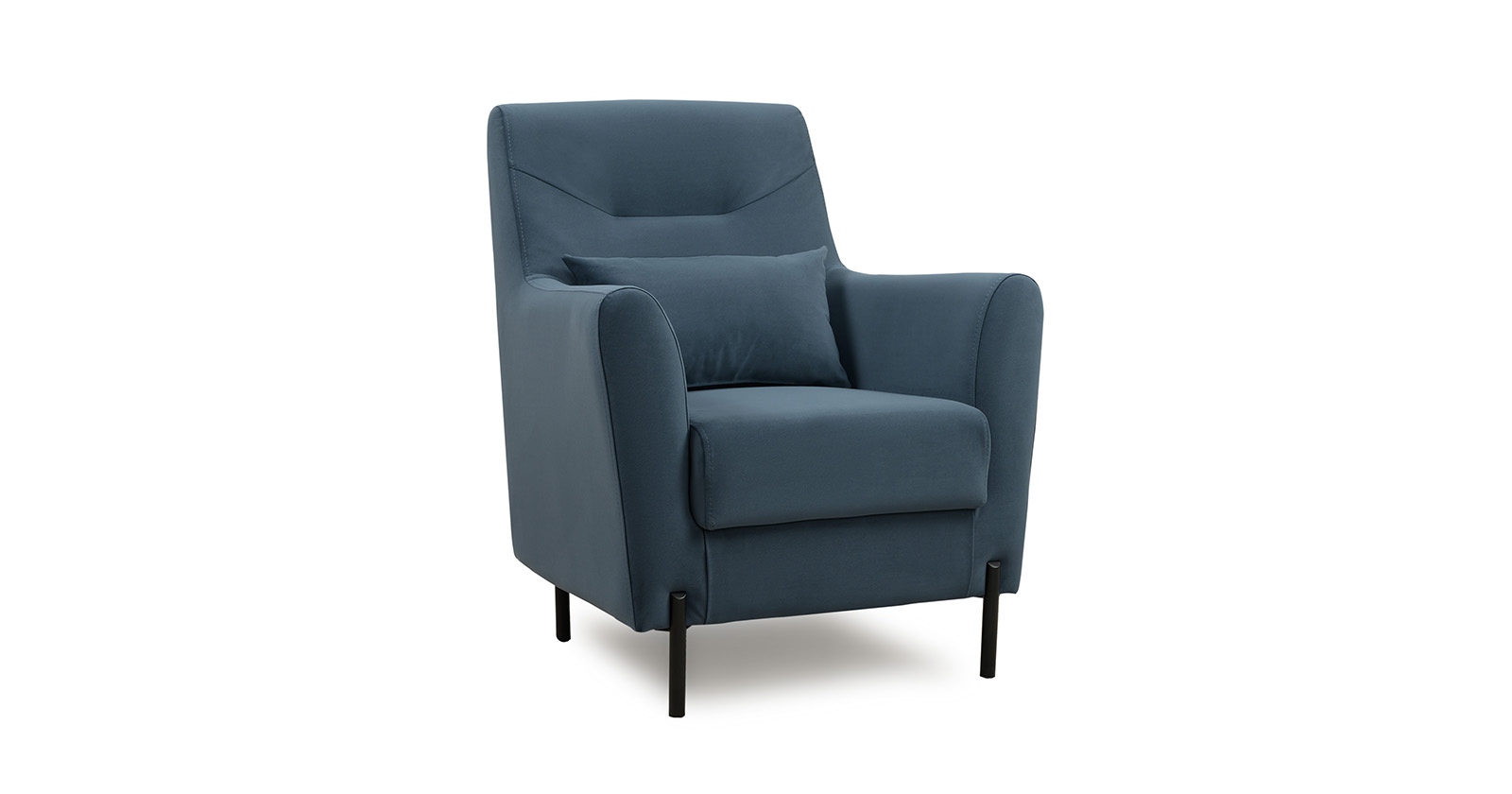 Декоративная утяжка на спинке кресла, декоративная подушка в цвете кресла, металлические опоры переходят в декоративный элемент подлокотника
