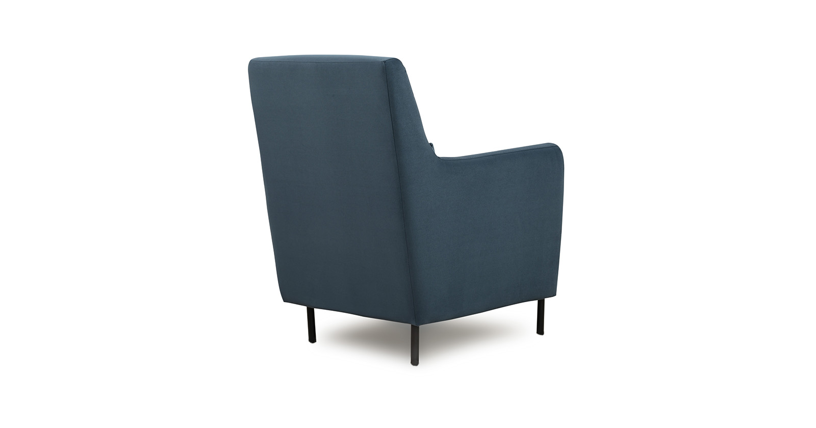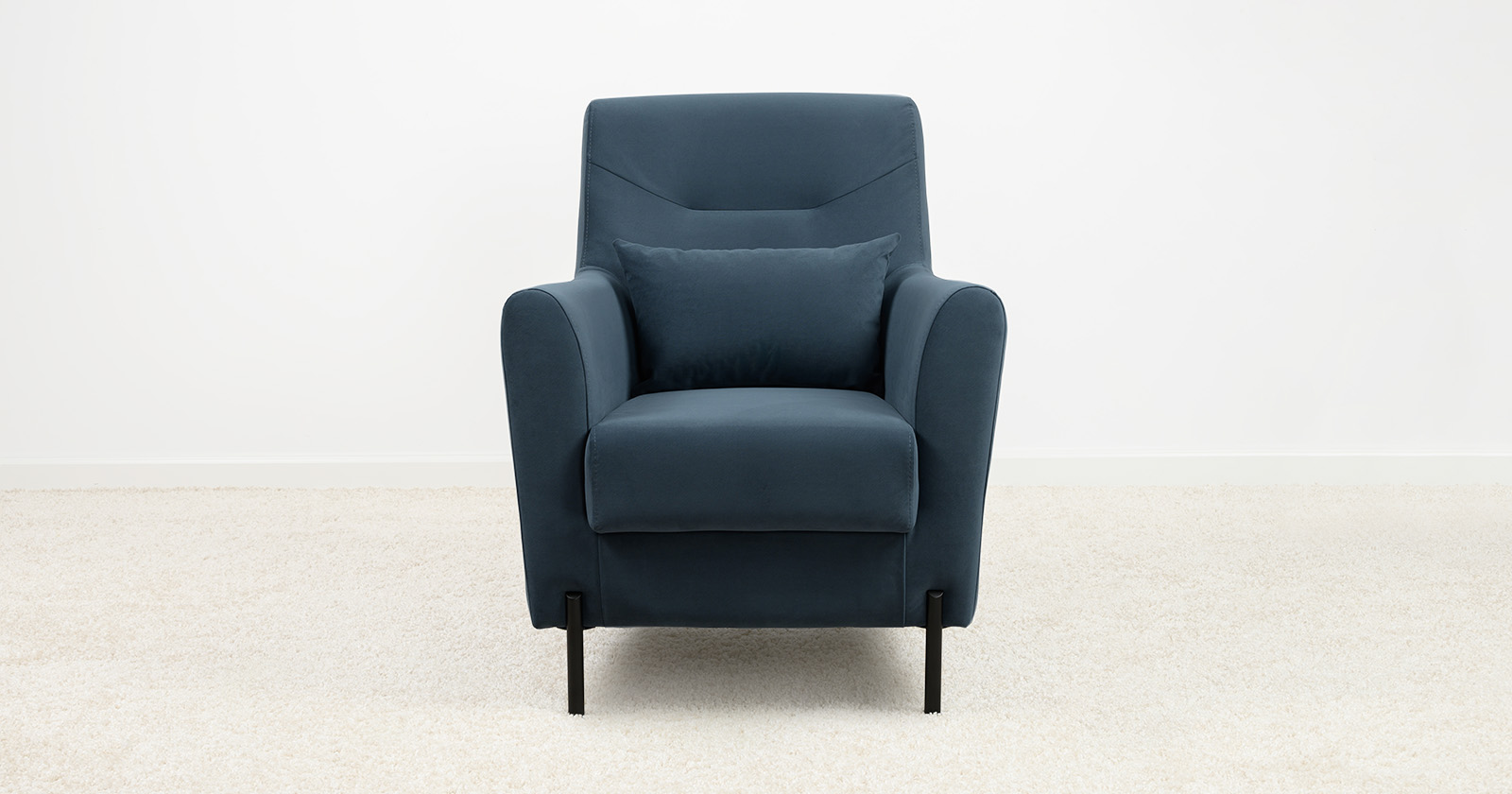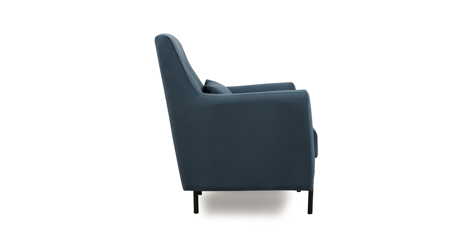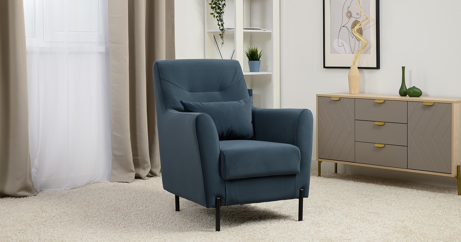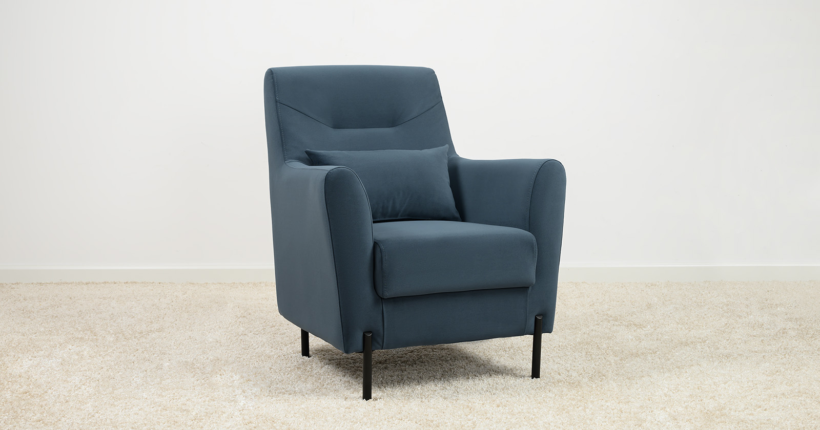 Декоративная утяжка на спинке кресла, декоративная подушка в цвете кресла, металлические опоры переходят в декоративный элемент подлокотника