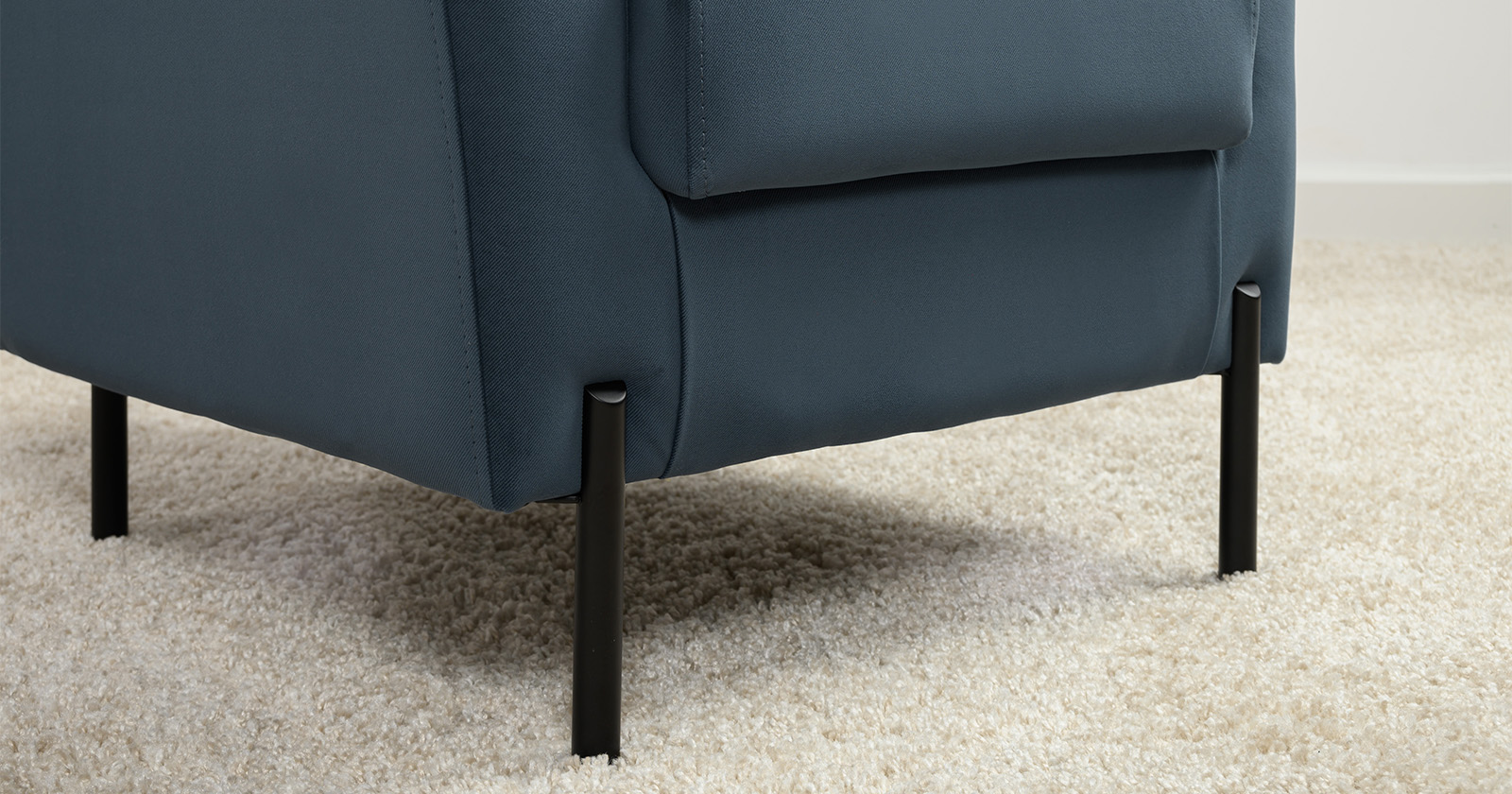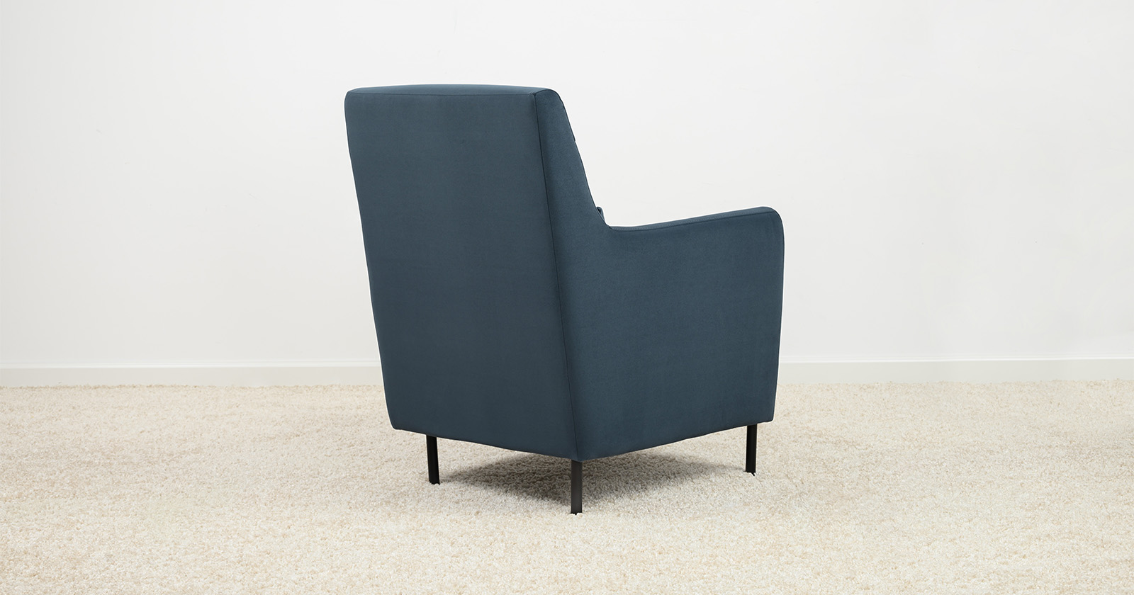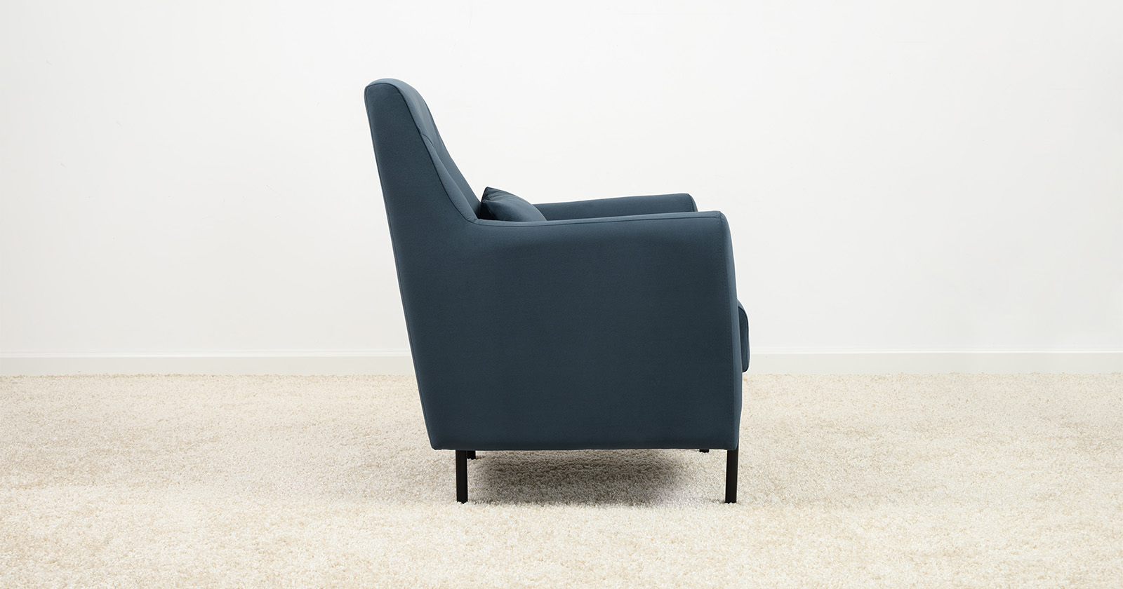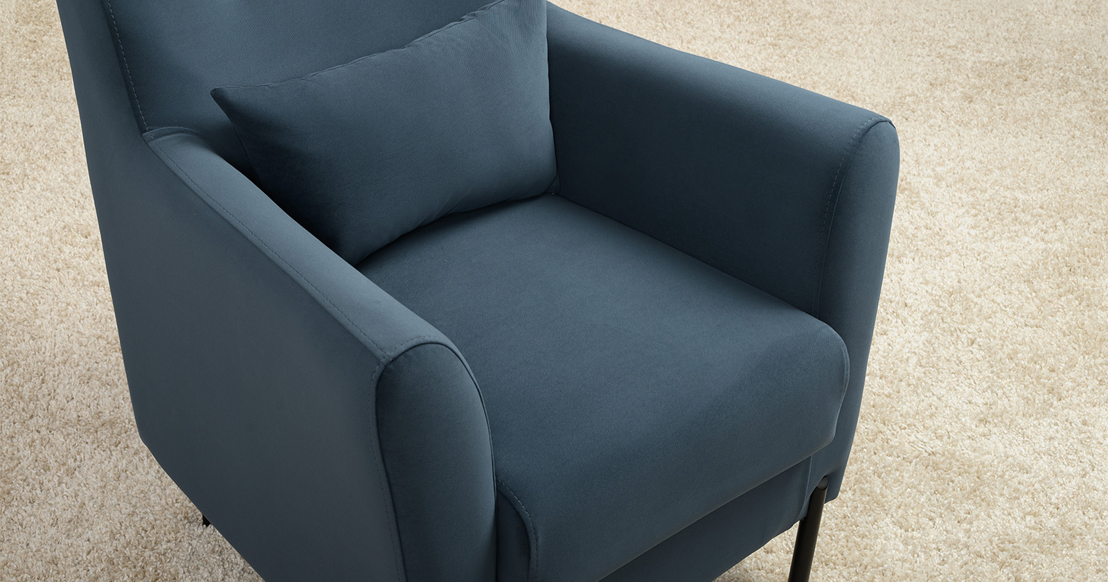 Декоративная утяжка на спинке кресла, декоративная подушка в цвете кресла, металлические опоры переходят в декоративный элемент подлокотника