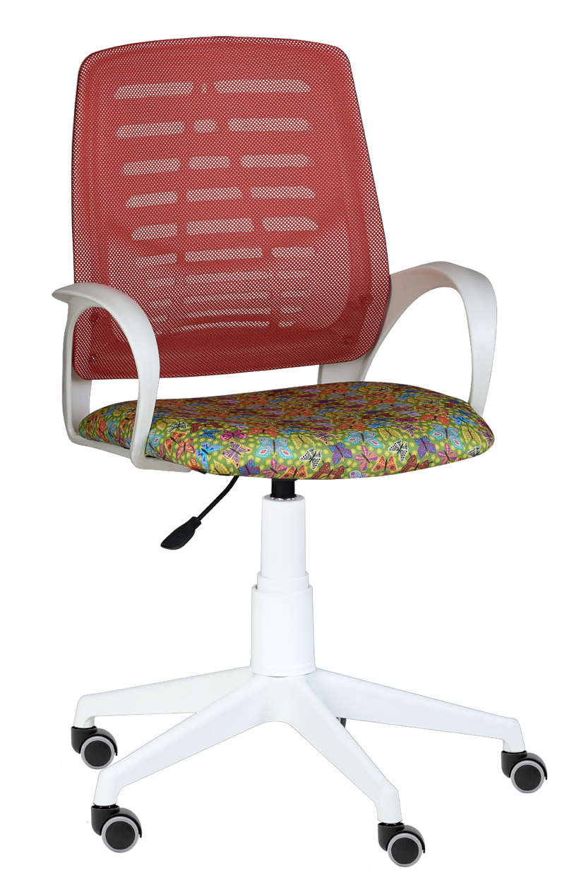 Кресло на колесах Ирис белый каркас, обивка сидушка - ткань саржа бабочки, спинка красный,  подлокотники пластик, крестовина пластик, без качания