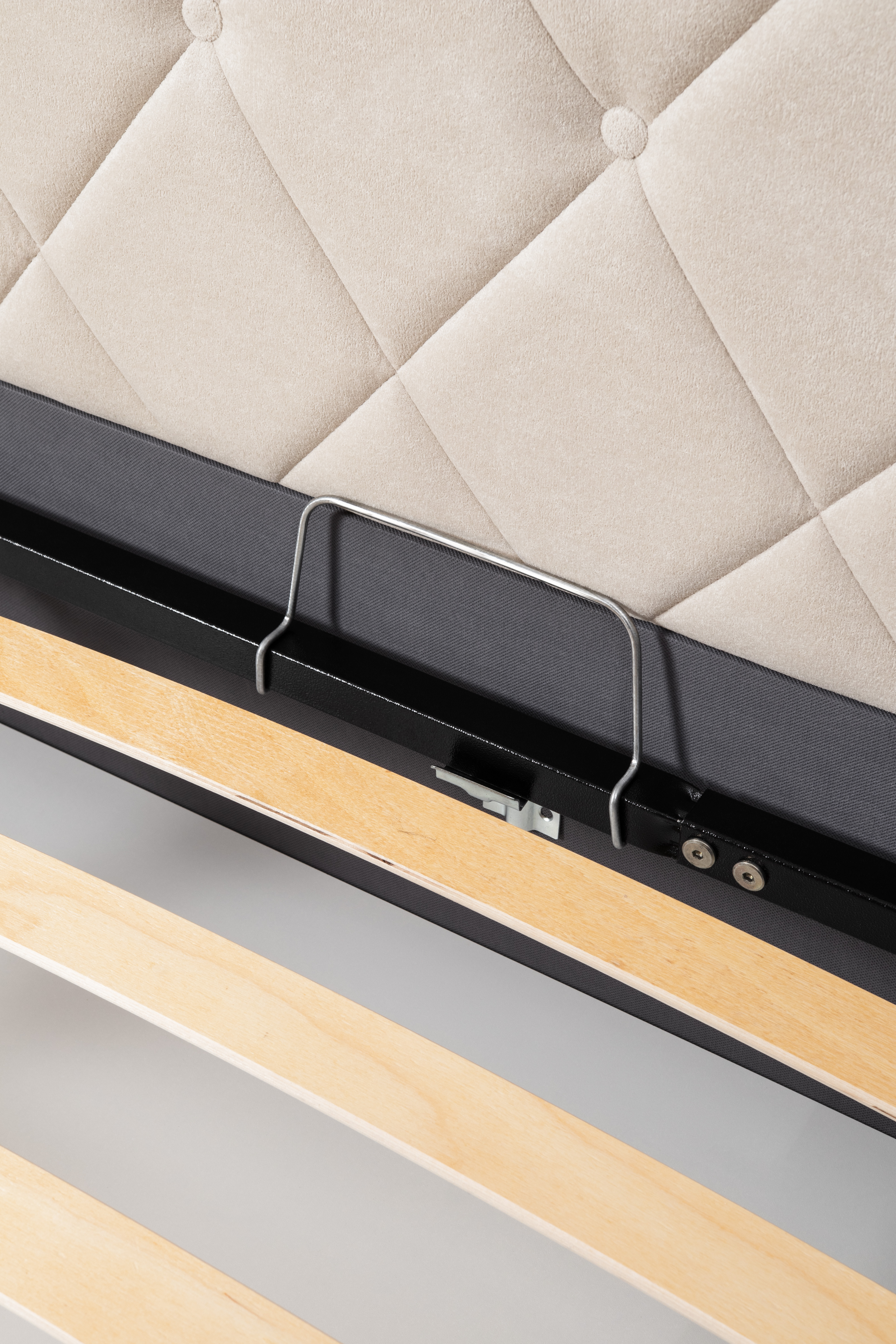 Основание кровати укомплектовано матрасодержателями. Жесткое кроватное дно из ЛДСП 16 мм на опорах 25 мм.