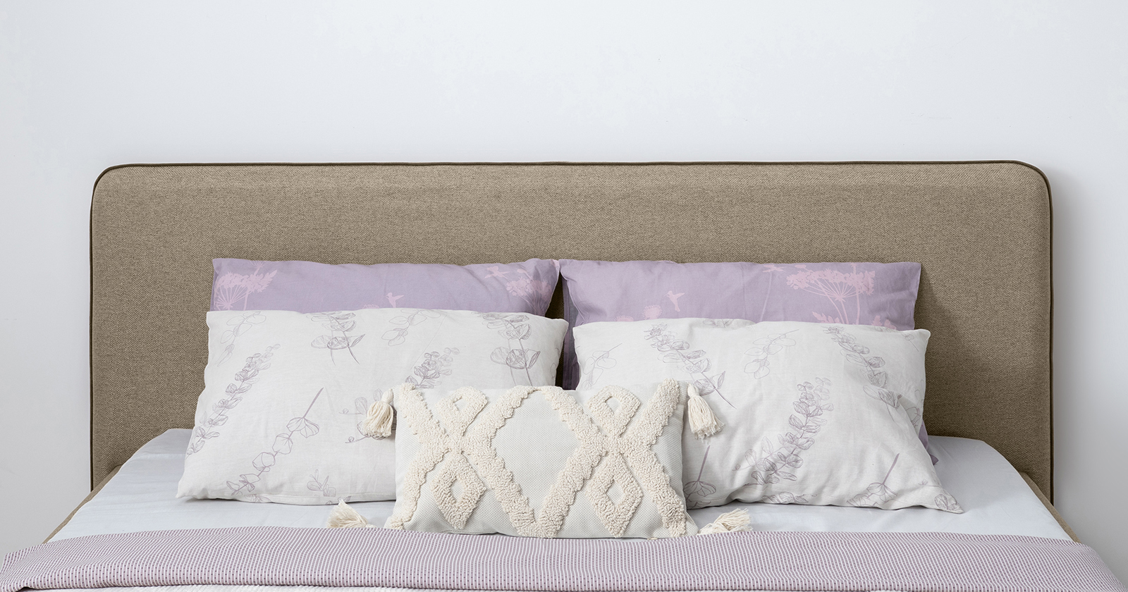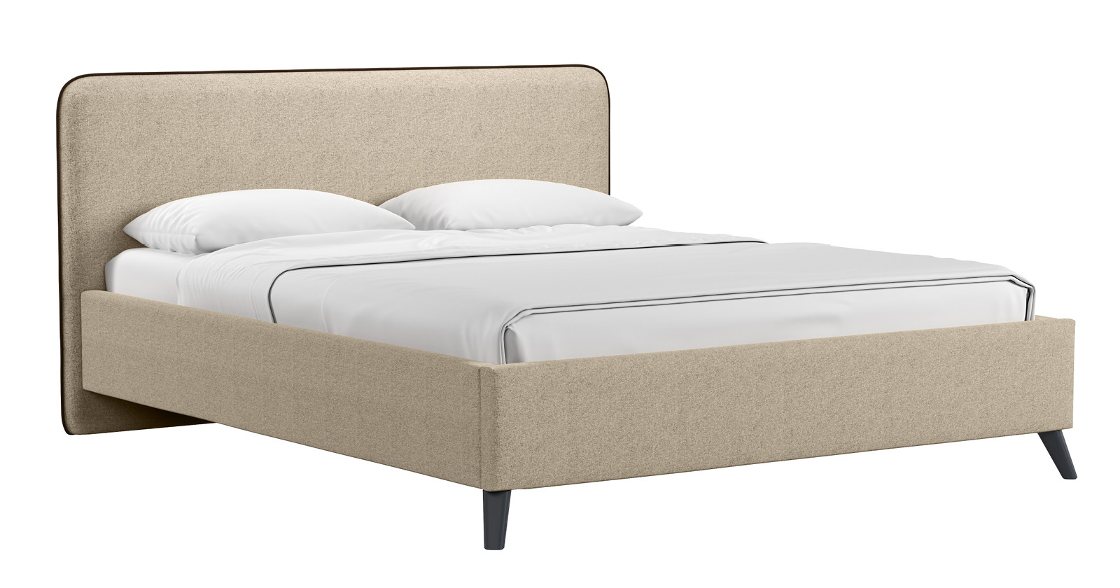 Cкругленный торец изголовья оформлен контрастным кантом.