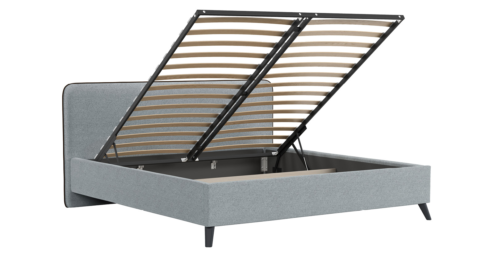 Основание кровати укомплектовано матрасодержателями. Жесткое кроватное дно из МДФ 6 мм. Задняя стенка изголовья выполнена в тех. ткани (спанбонд).