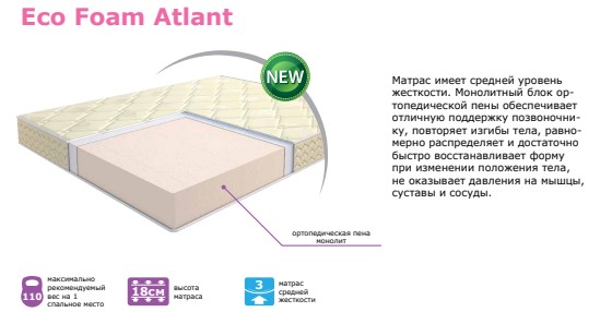 Матрас имеет средней уровень жесткости. Монолитный блок ортопедической пены обеспечивает отличную поддержку позвоночнику, повторяет изгибы тела, равномерно распределяет и достаточно быстро восстанавливает форму при изменении положения тела, не оказывает давления на мышцы, суставы и сосуды.