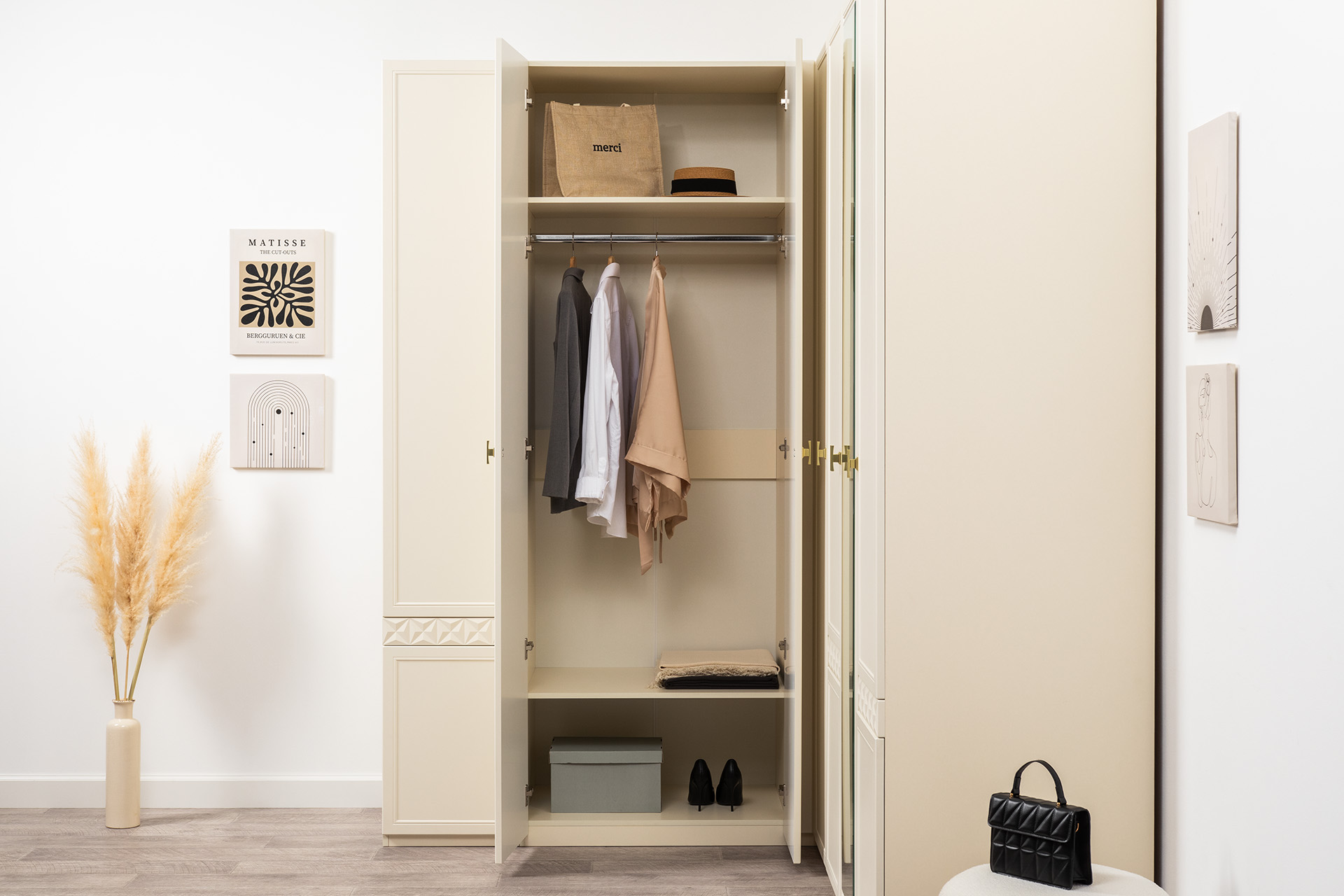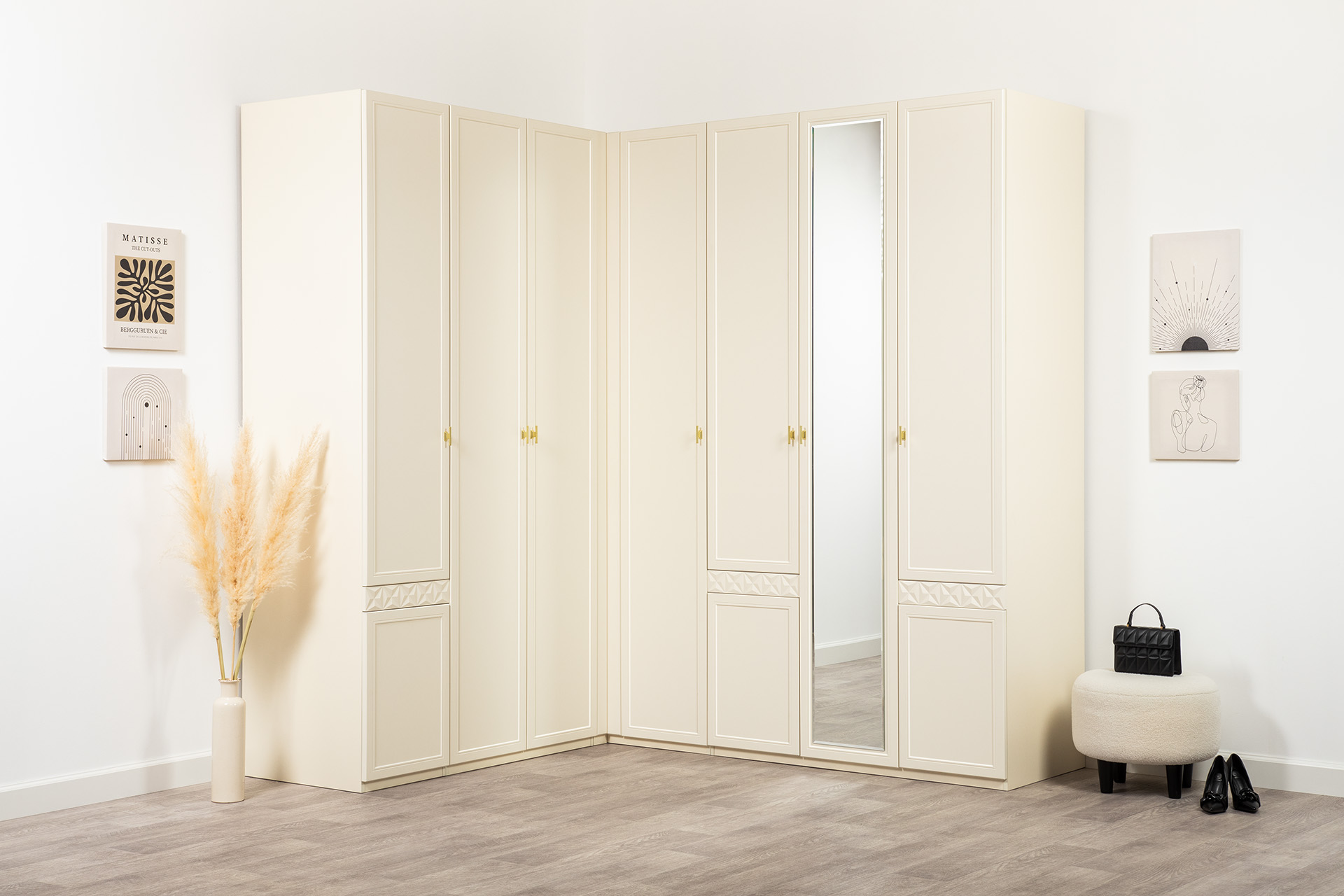 Изящные линии, глубокая фрезеровка фасадов из МДФ и благородные оттенки. Утончённая «Слоновая кость» и изысканная «Олива Шагрень» с глубоким зелёным тоном — создают атмосферу уюта, тепла и благородства. Металлические ручки и опоры золотого цвета придают мебели утончённый блеск, а петли и направляющие с доводчиками обеспечивают плавное и бесшумное закрытие фасадов.