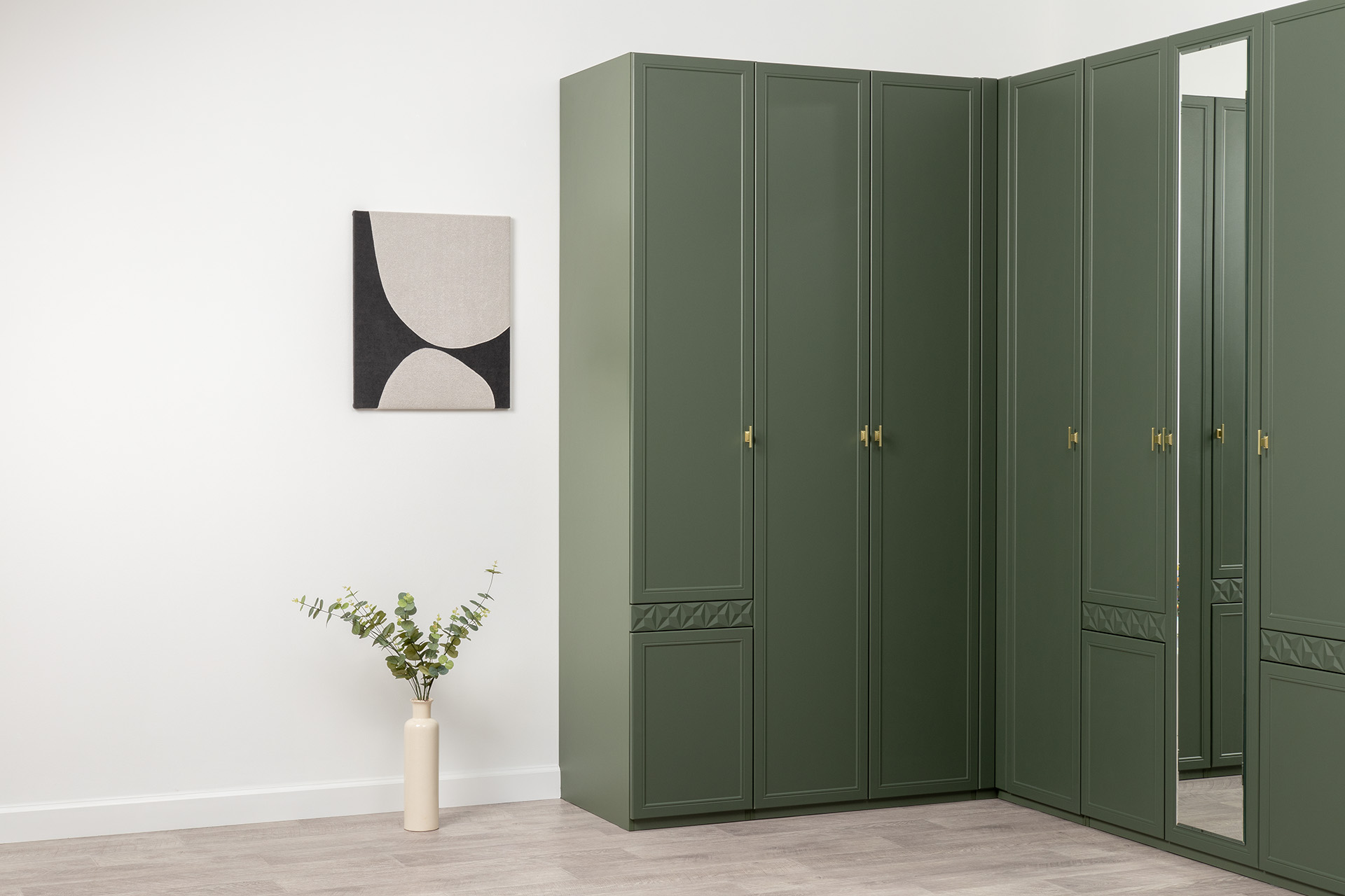 Изящные линии, глубокая фрезеровка фасадов из МДФ и благородные оттенки. Утончённая «Слоновая кость» и изысканная «Олива Шагрень» с глубоким зелёным тоном — создают атмосферу уюта, тепла и благородства. Металлические ручки и опоры золотого цвета придают мебели утончённый блеск, а петли и направляющие с доводчиками обеспечивают плавное и бесшумное закрытие фасадов.