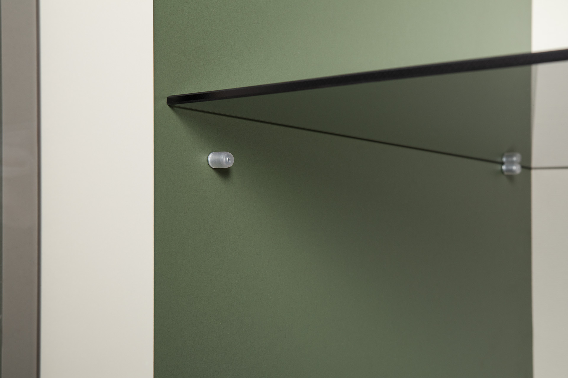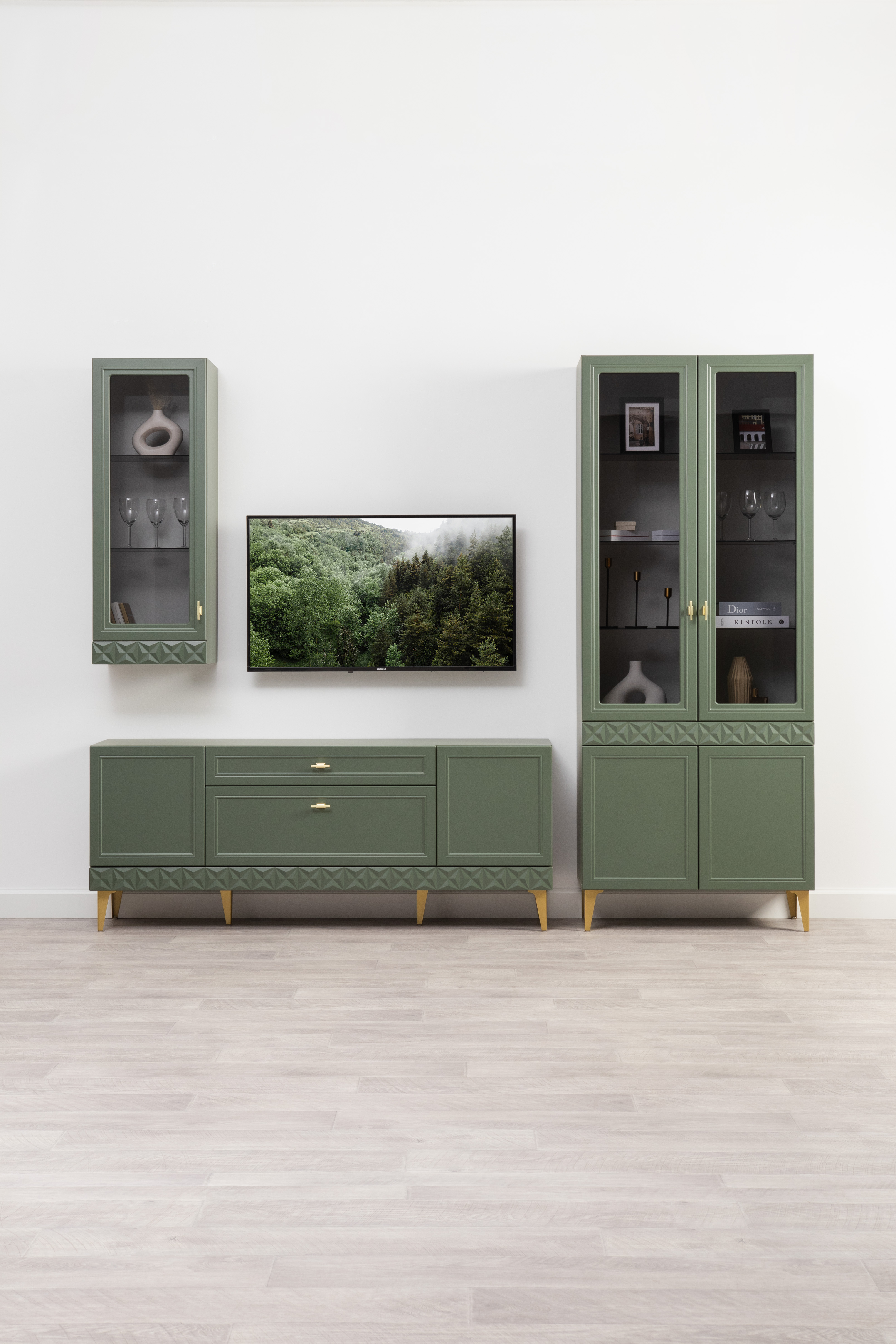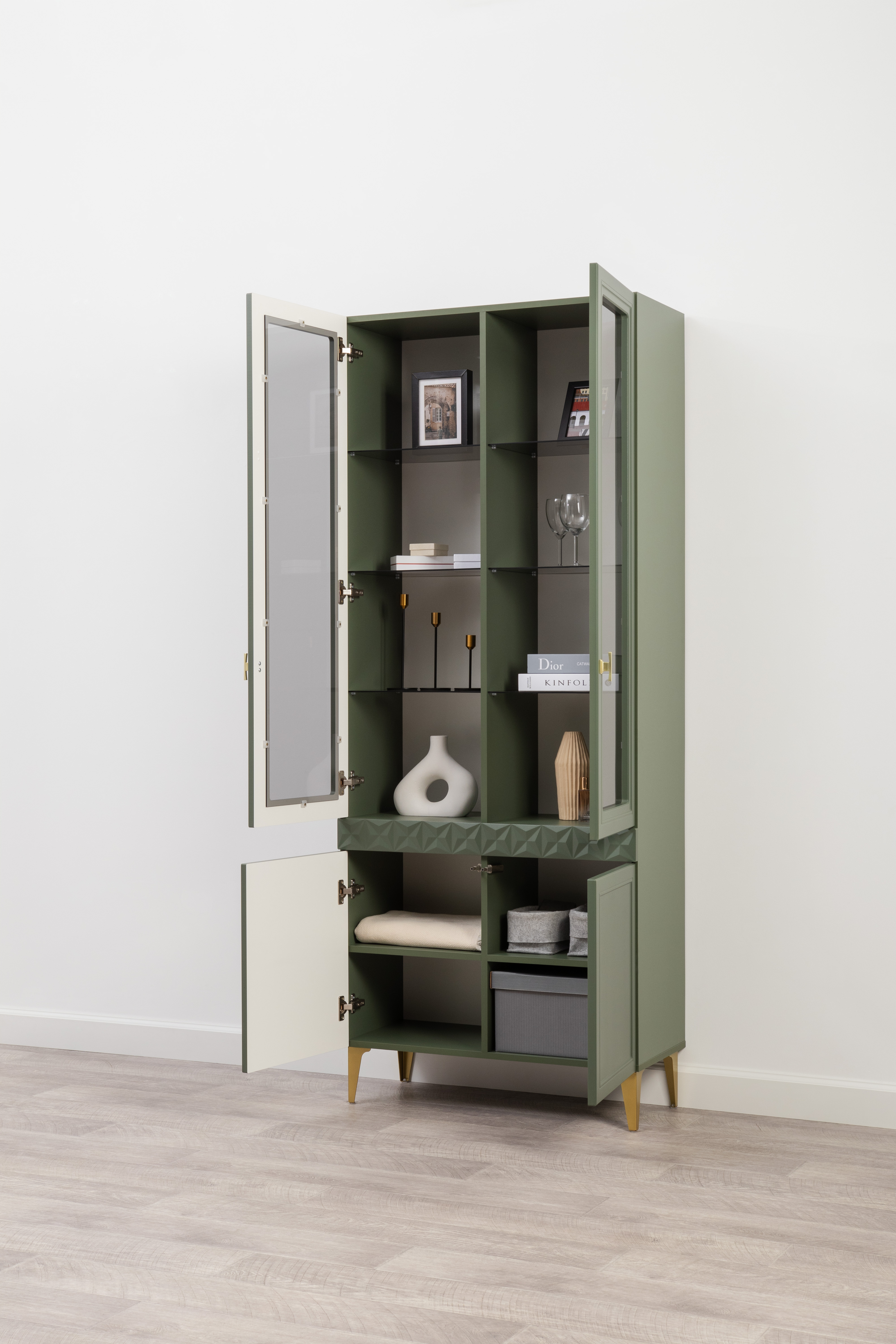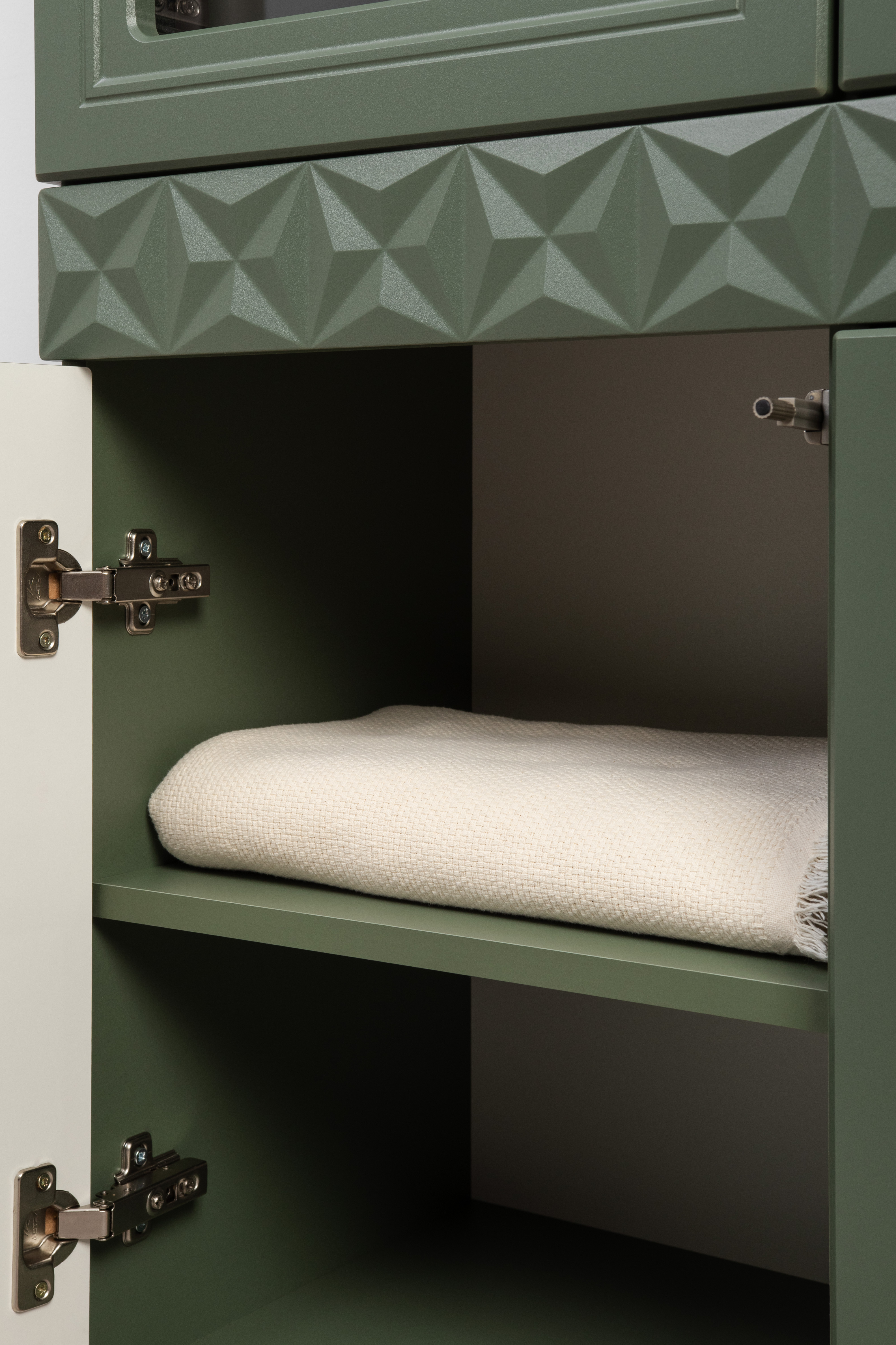 Изящные линии, глубокая фрезеровка фасадов из МДФ и благородные оттенки. Утончённая «Слоновая кость» и изысканная «Олива Шагрень» с глубоким зелёным тоном — создают атмосферу уюта, тепла и благородства. Металлические ручки и опоры золотого цвета придают мебели утончённый блеск, а петли и направляющие с доводчиками обеспечивают плавное и бесшумное закрытие фасадов.