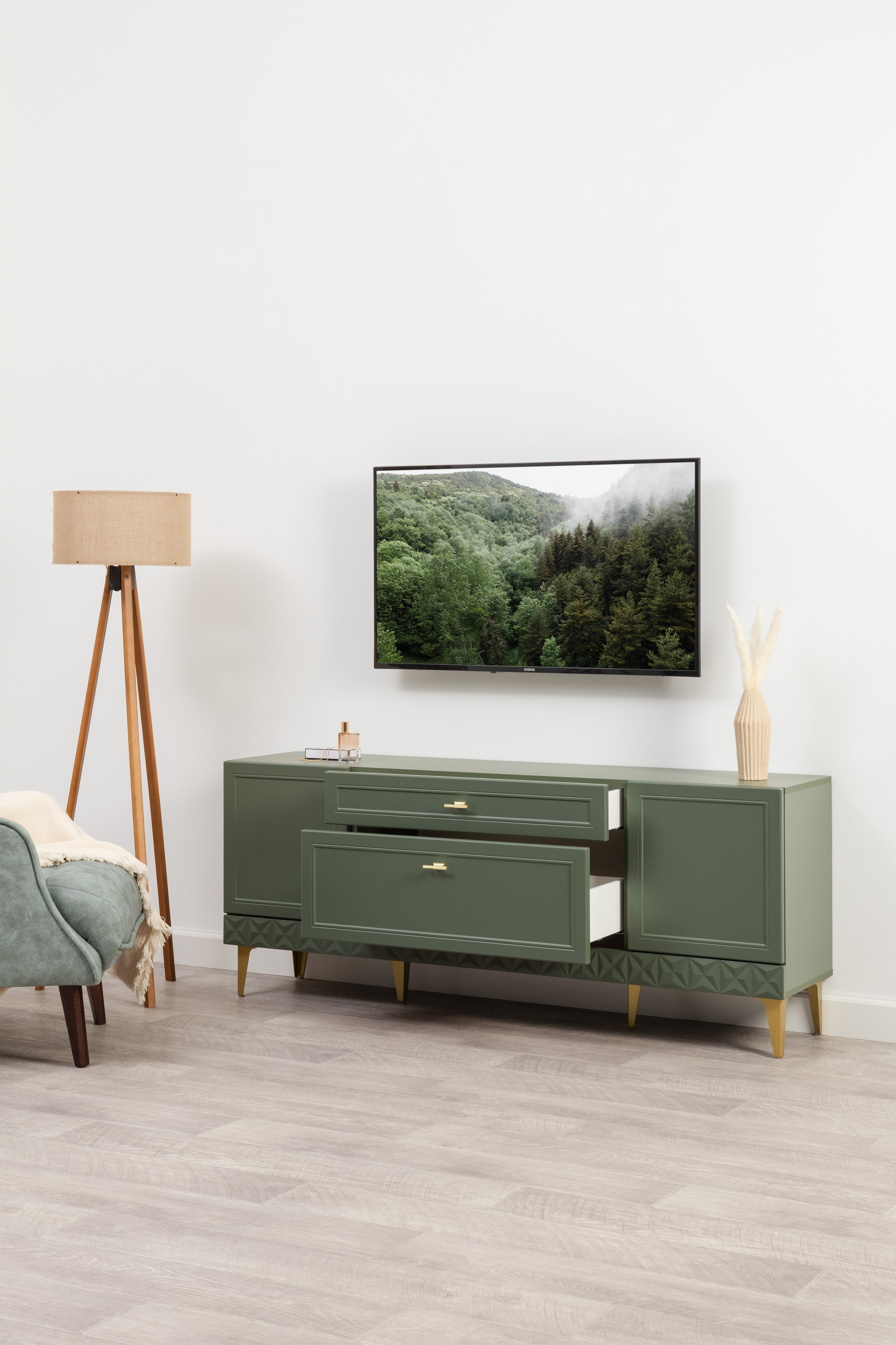Изящные линии, глубокая фрезеровка фасадов из МДФ и благородные оттенки. Утончённая «Слоновая кость» и изысканная «Олива Шагрень» с глубоким зелёным тоном — создают атмосферу уюта, тепла и благородства. Металлические ручки и опоры золотого цвета придают мебели утончённый блеск, а петли и направляющие с доводчиками обеспечивают плавное и бесшумное закрытие фасадов.