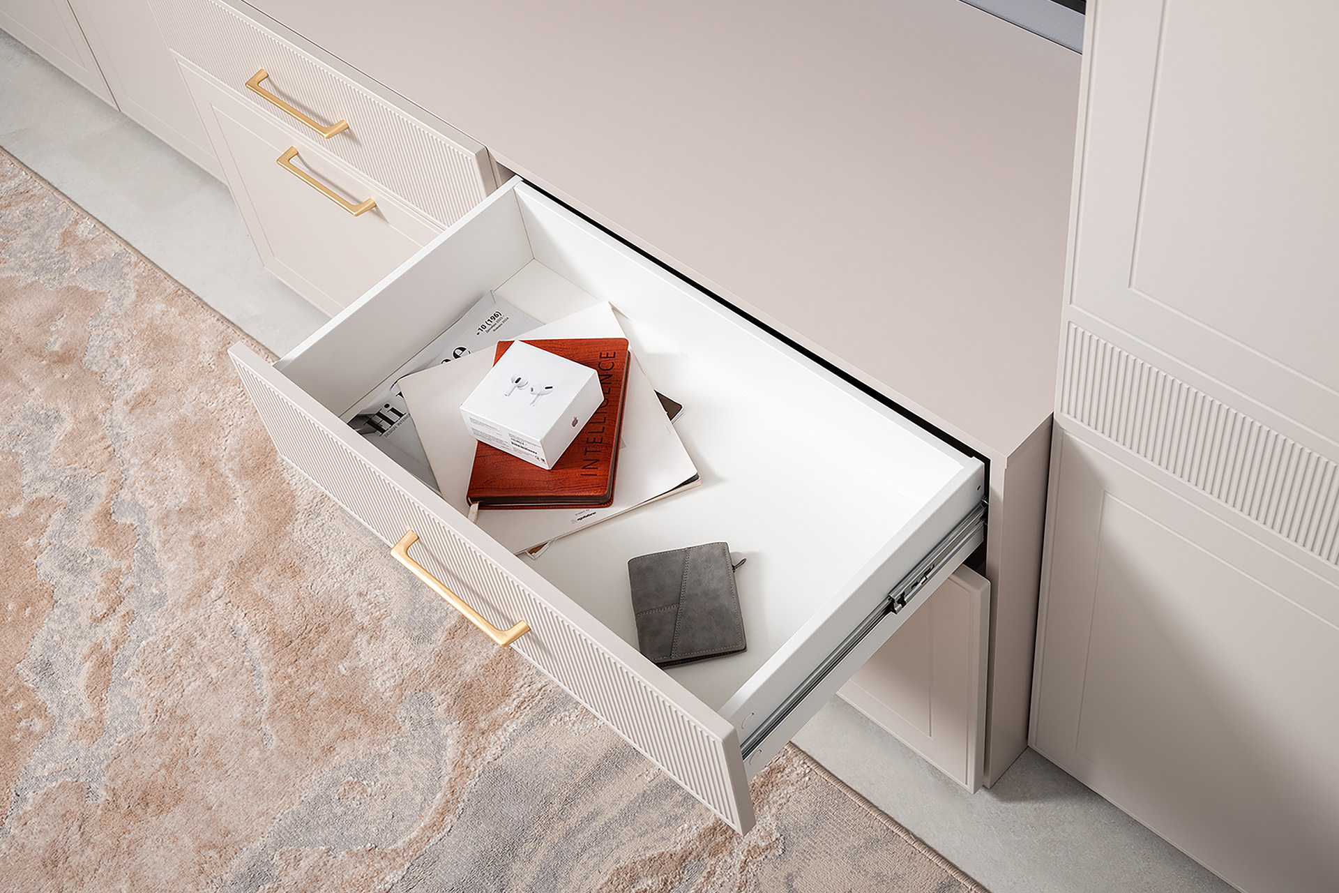Петли с доводчиками, полное выдвижение ящиков, выдвижная штанга в шкафу для одежды и съемные полки делают использование максимально комфортным.
