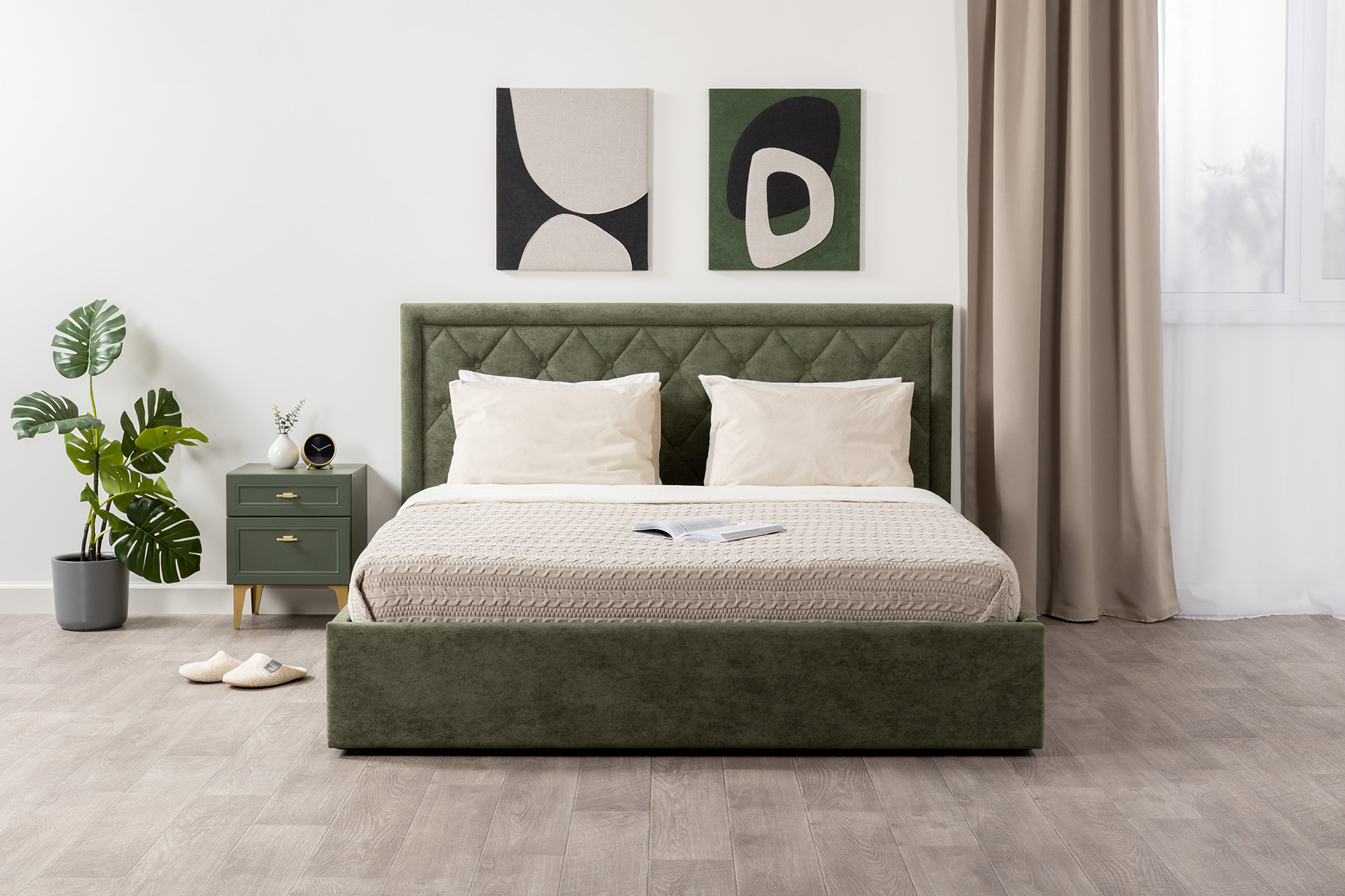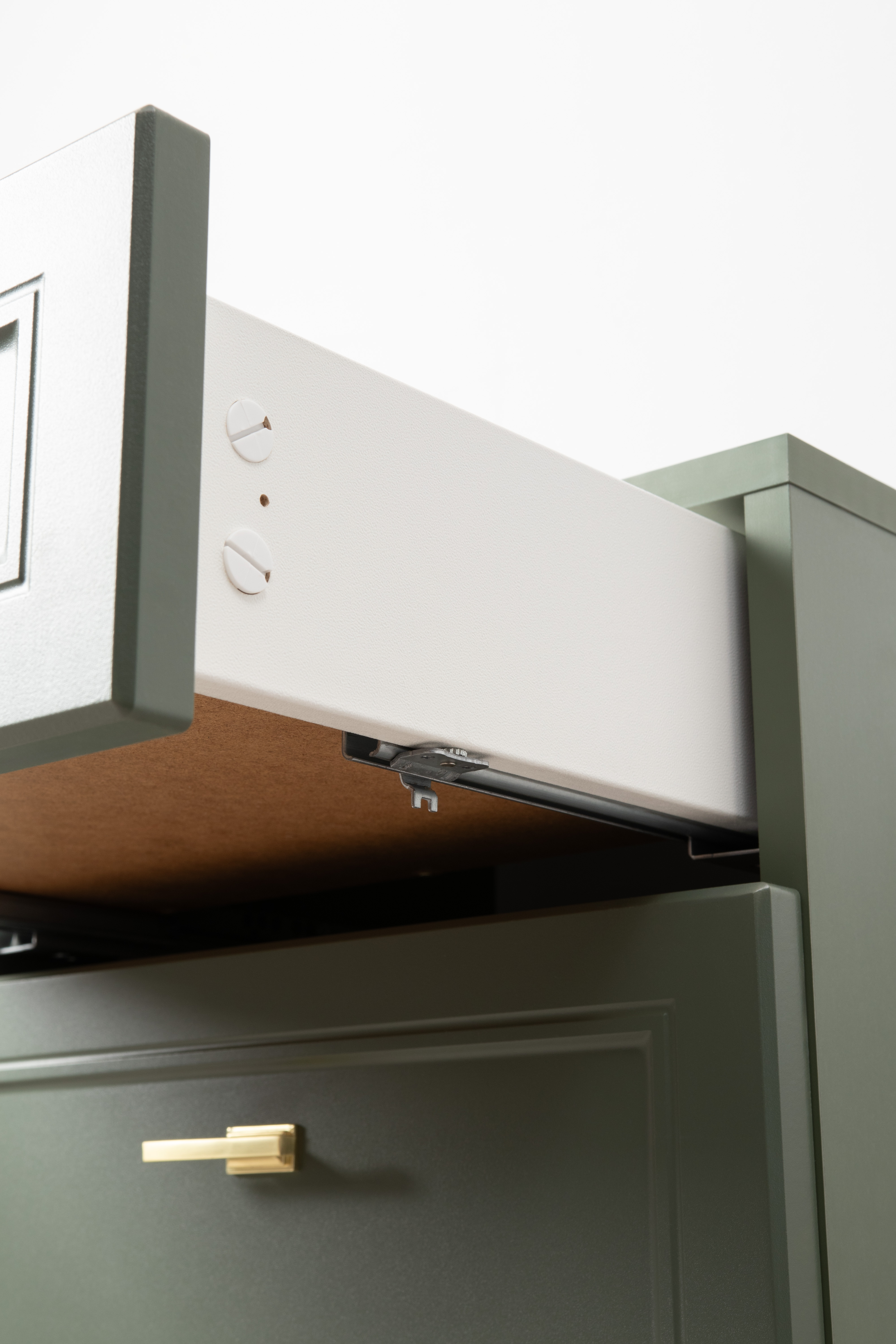 Изящные линии, глубокая фрезеровка фасадов из МДФ и благородные оттенки. Утончённая «Слоновая кость» и изысканная «Олива Шагрень» с глубоким зелёным тоном — создают атмосферу уюта, тепла и благородства. Металлические ручки и опоры золотого цвета придают мебели утончённый блеск, а петли и направляющие с доводчиками обеспечивают плавное и бесшумное закрытие фасадов.