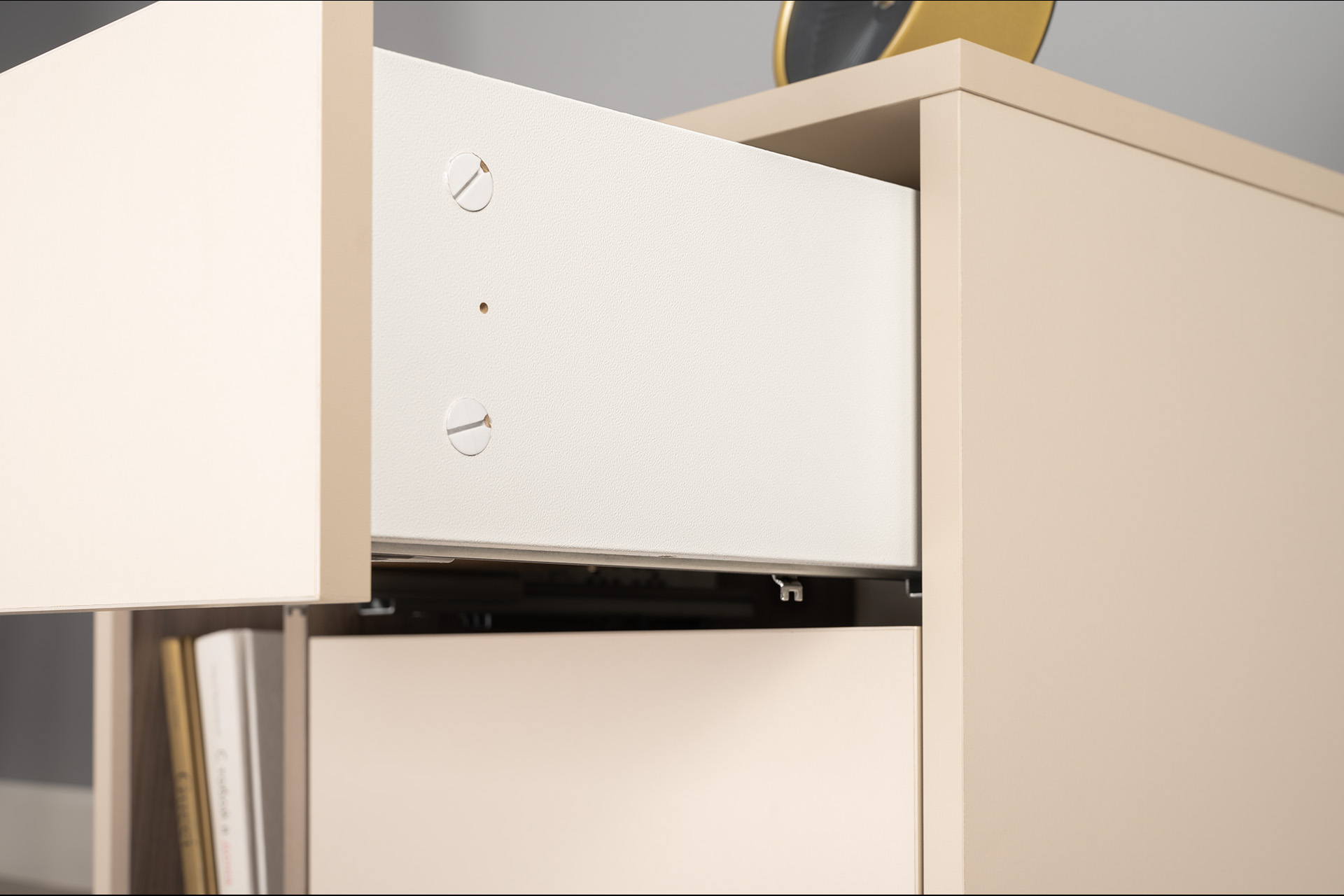 Фасады с механизмом push-to-open, направляющие скрытого монтажа, петли с доводчиками, утолщённая кромка – комфорт продуман до мелочей.